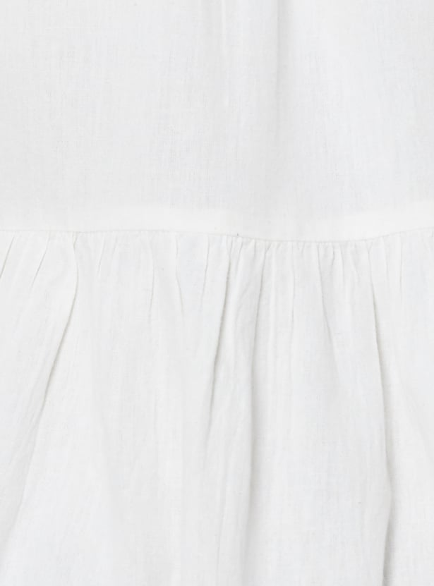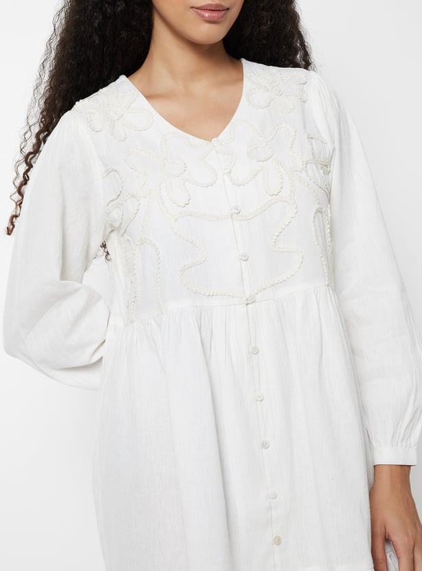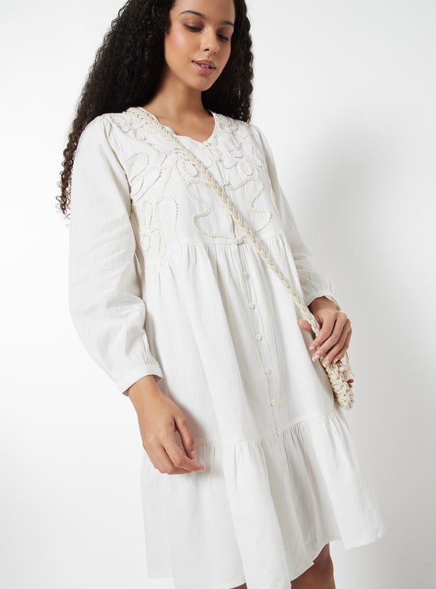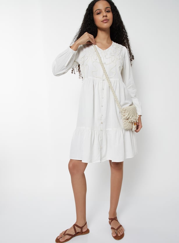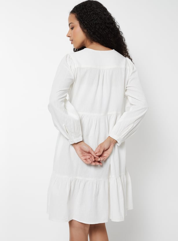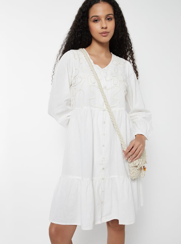 This V-neck tiered dress features a beautifully embroidered yoke design and elegant full blouson sleeves. It includes a button-down placket and side pockets, offering both comfort and functional style in a regular fit silhouette.