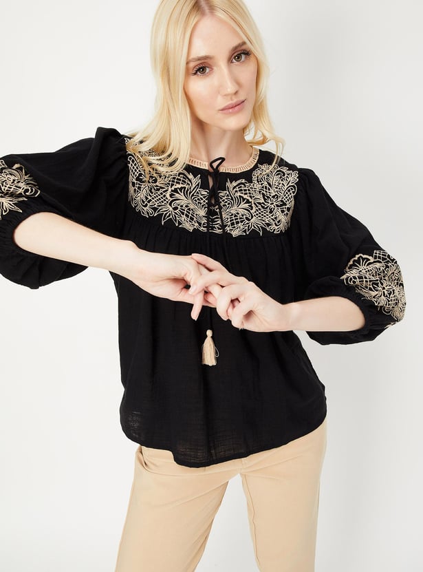 Empower your essence with this embroidered top in your collection featuring a tie-up neck with tassels, three-quarter puffed sleeves in regular length.