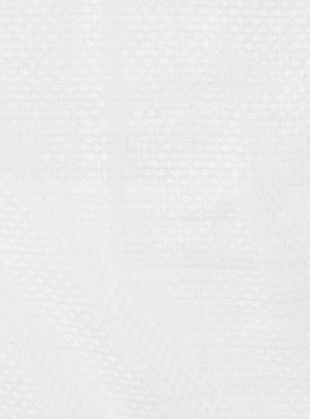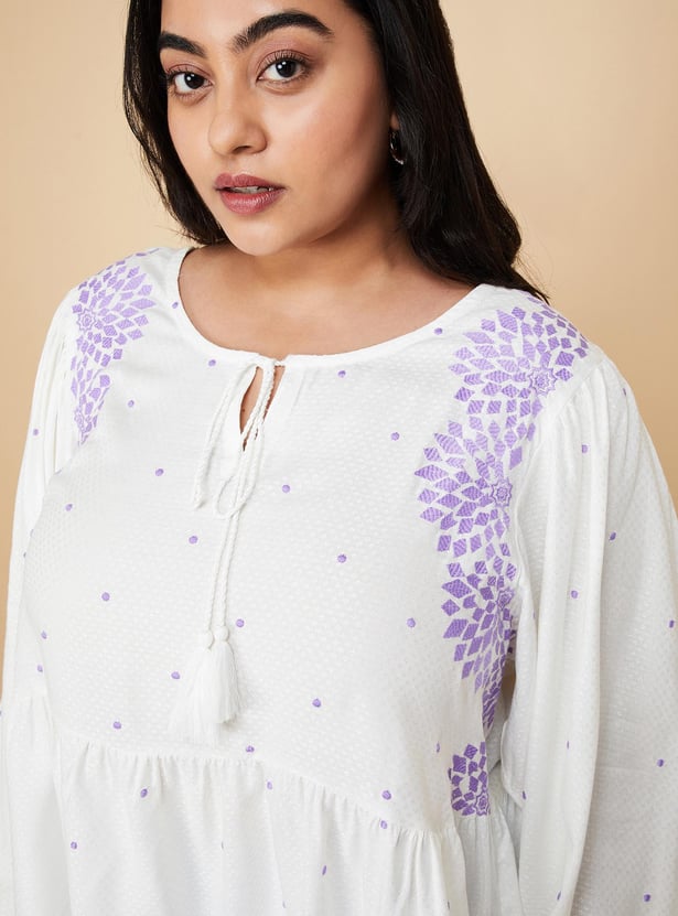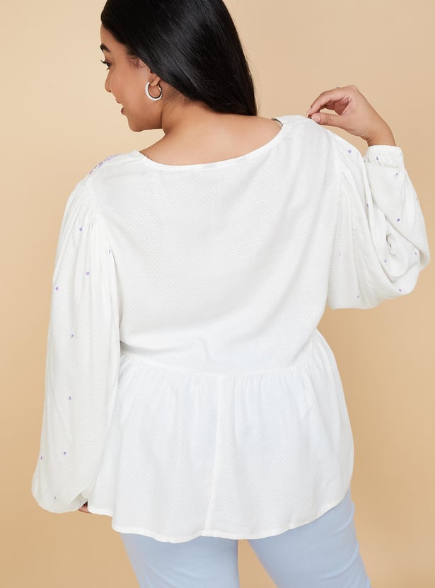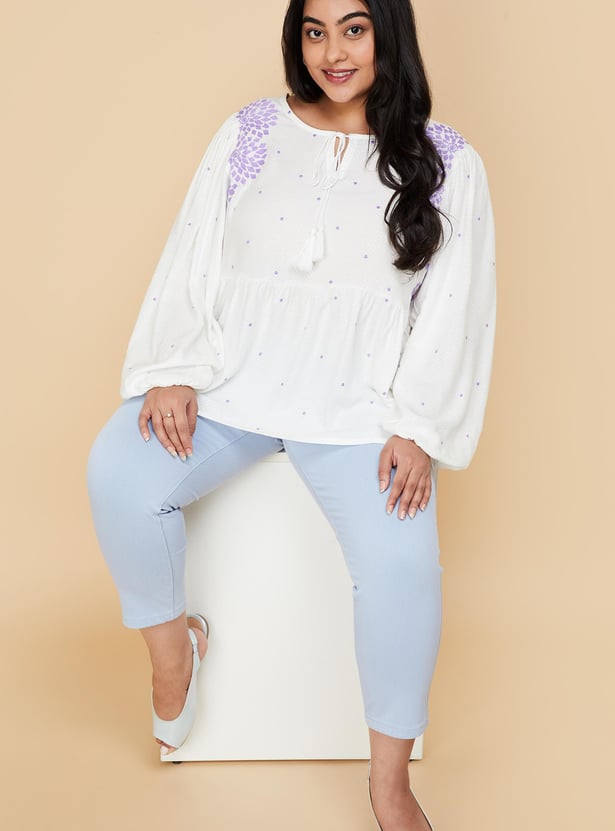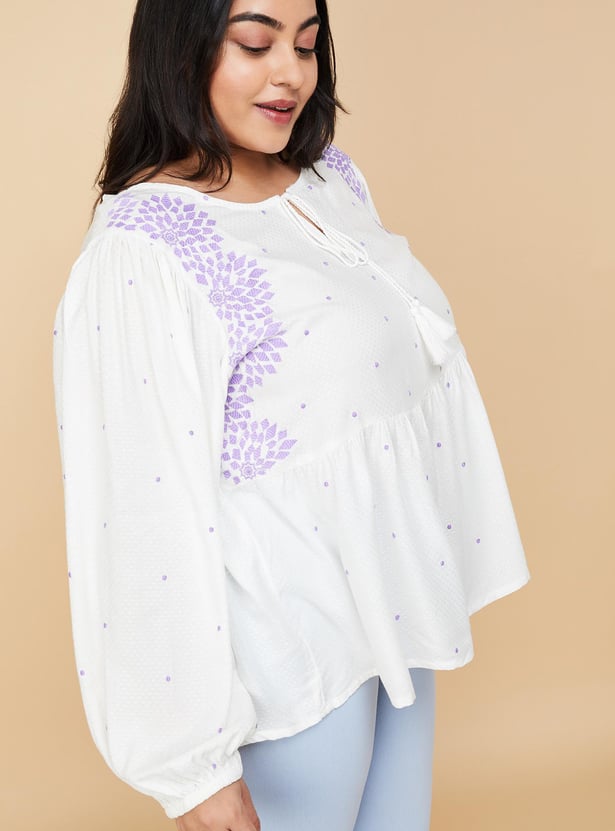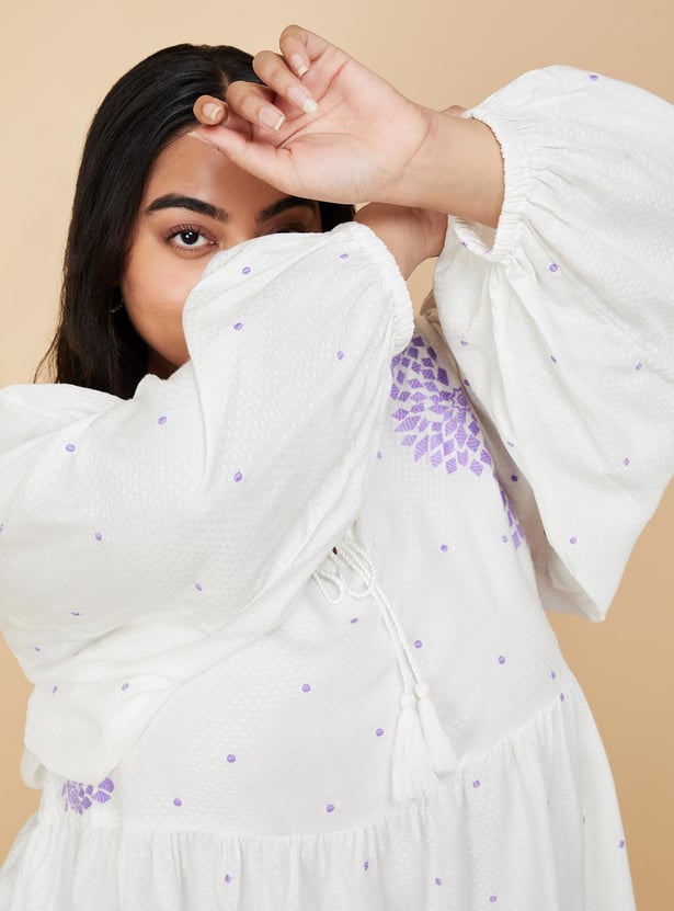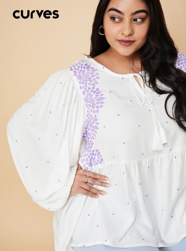Breezy and elegant, this top is sure to become a wardrobe repeat. It has a tie-up neck, balloon sleeves with elasticated cuffs, a gathered waist, and a flared hem. this top is updated with all-over embroidery and woven design. Model Size :