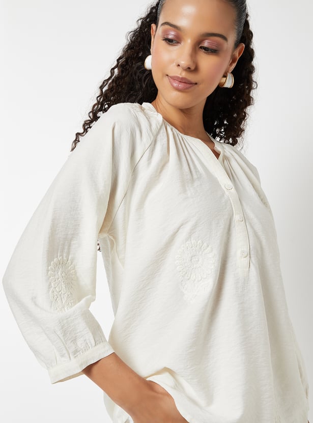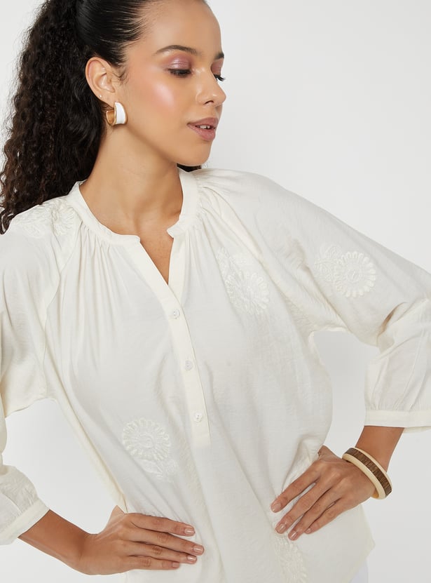 This embroidered tunic features a sleek band collar, button placket, and full sleeves, blending traditional detailing with modern style. Perfect for adding subtle elegance to your wardrobe.
