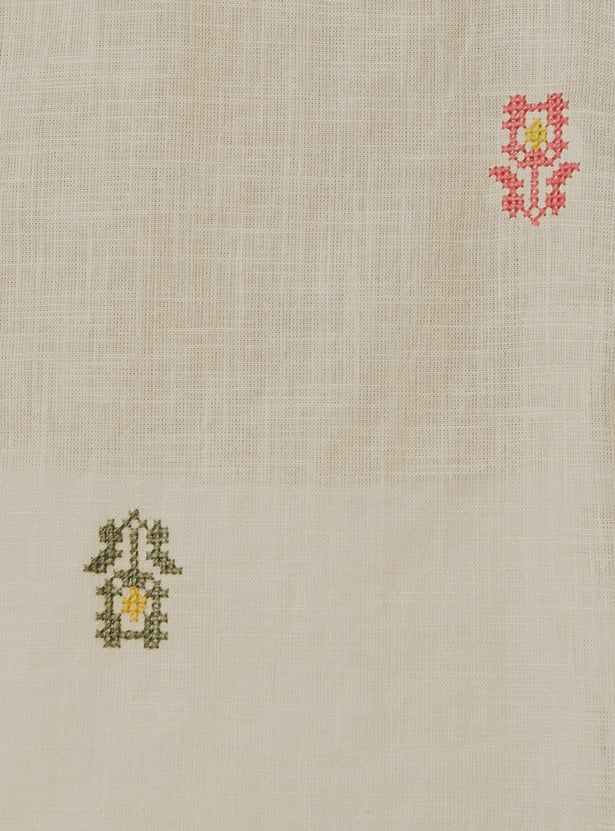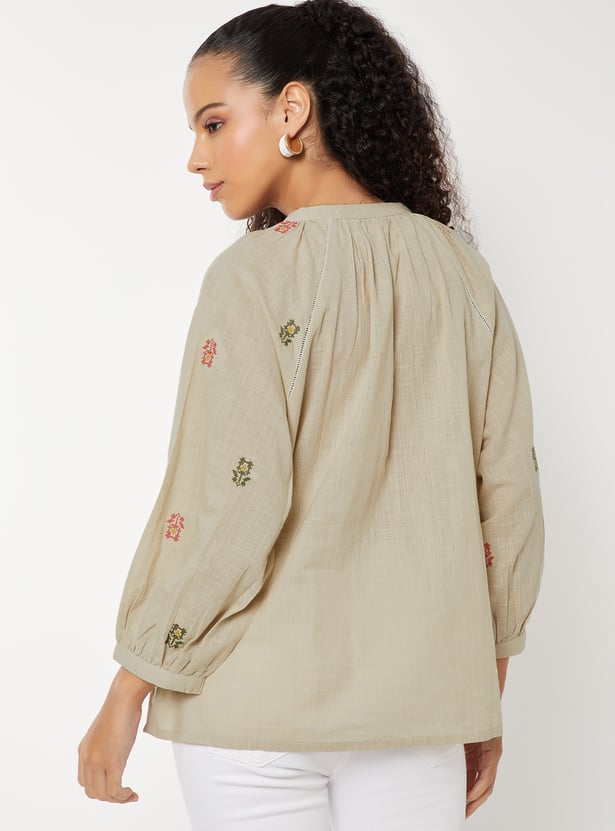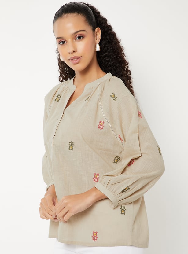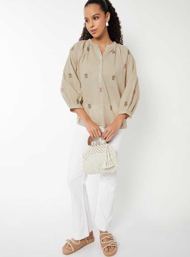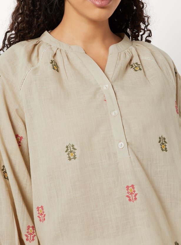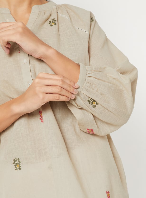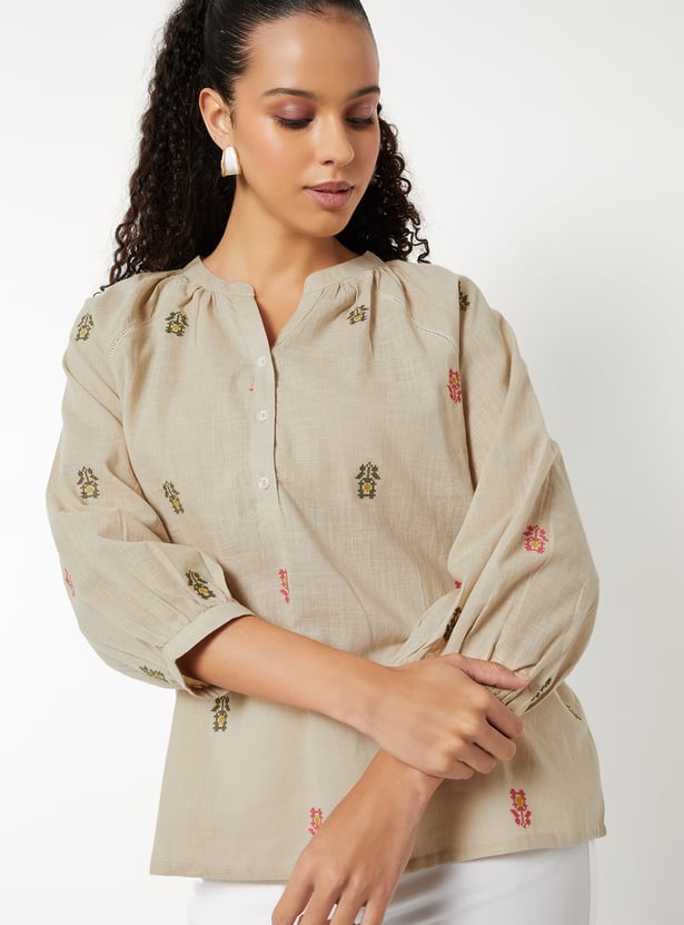 This embroidered tunic features a sleek band collar, button placket, and three-quarter sleeves, blending traditional detailing with modern style. Perfect for adding subtle elegance to your wardrobe.