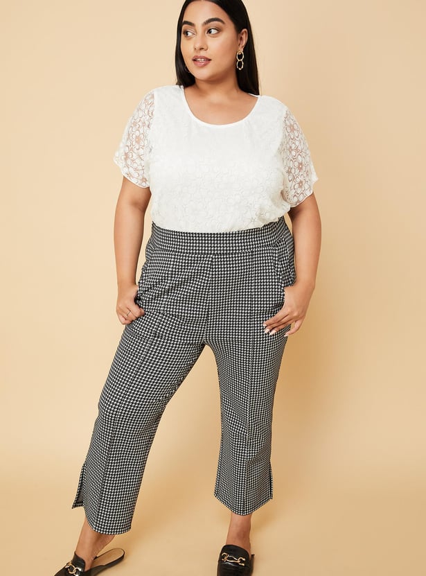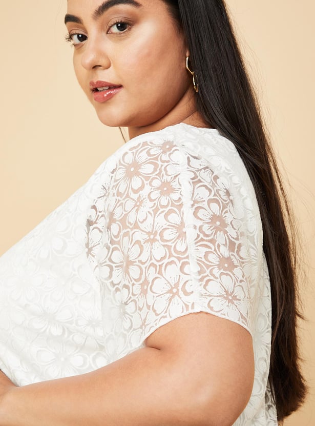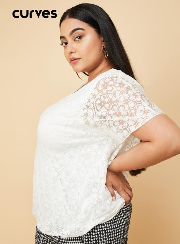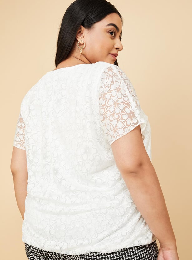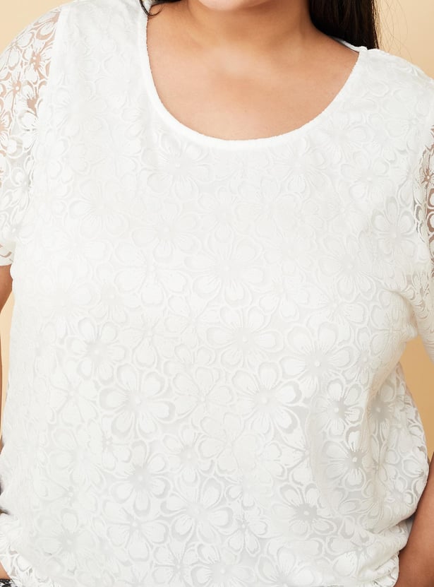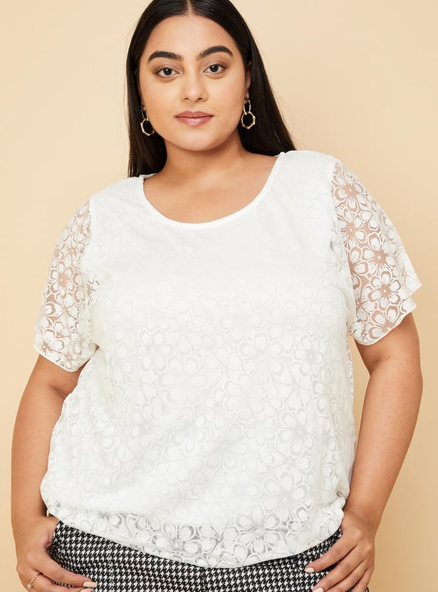 Infuse elegance into your day with this charming blouse. Adorned with a delightful floral pattern and featuring a round neck and half sleeves, it exudes timeless grace.