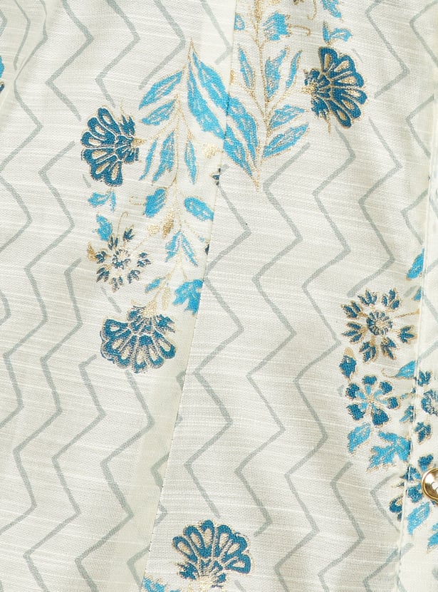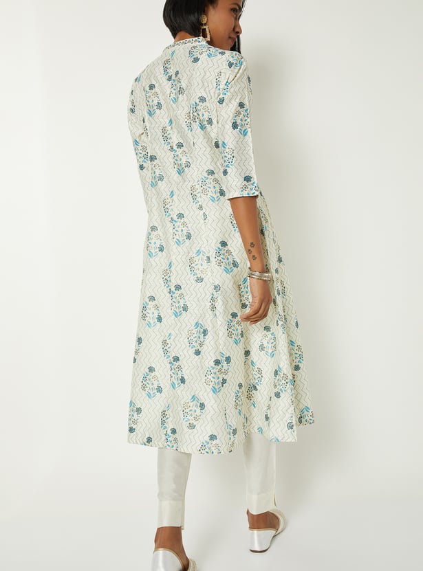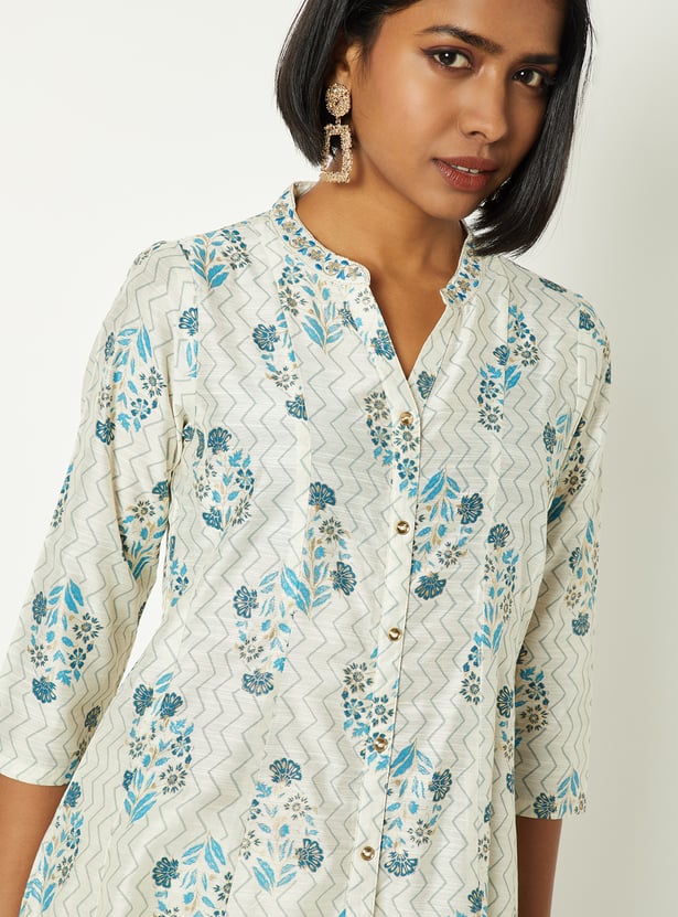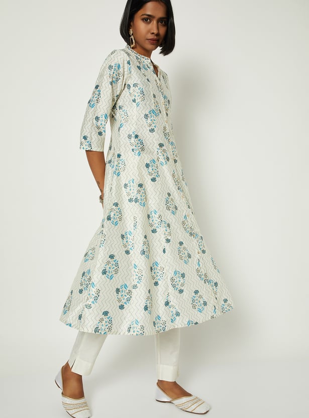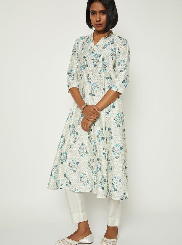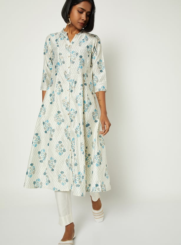 Bring effortless charm to your everyday style with this floral print A-line kurta. Featuring a band collar, three-quarter sleeves, and a graceful calf-length silhouette, it blends comfort with timeless elegance.