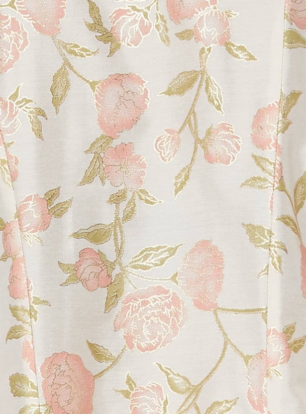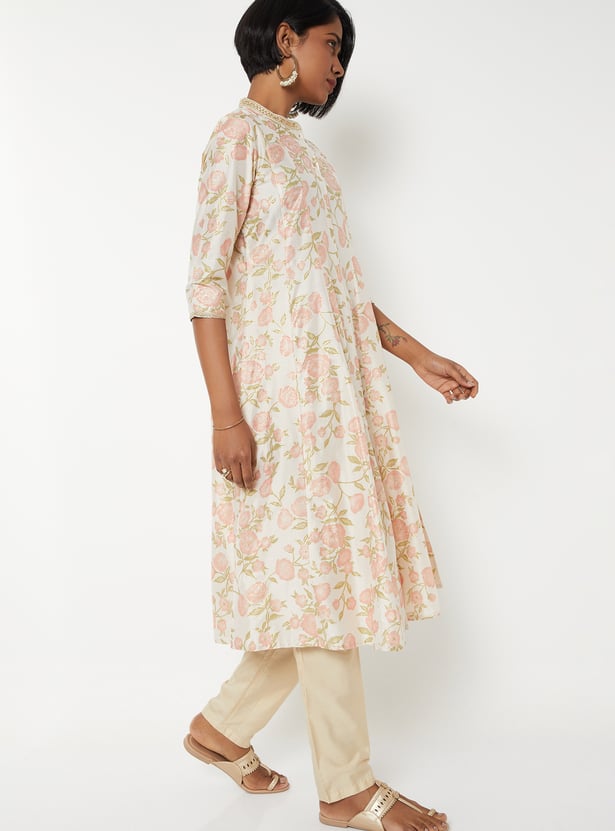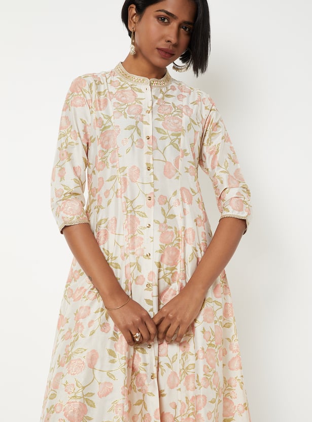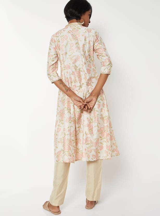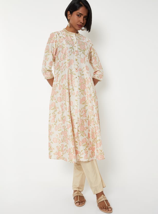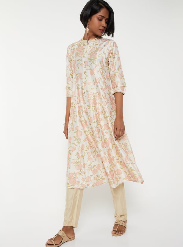 Refresh your ethnic wardrobe with this floral print A-line kurta. Designed with a smart band collar and 3/4th sleeves, it offers a graceful silhouette that’s perfect for everyday wear or casual gatherings.