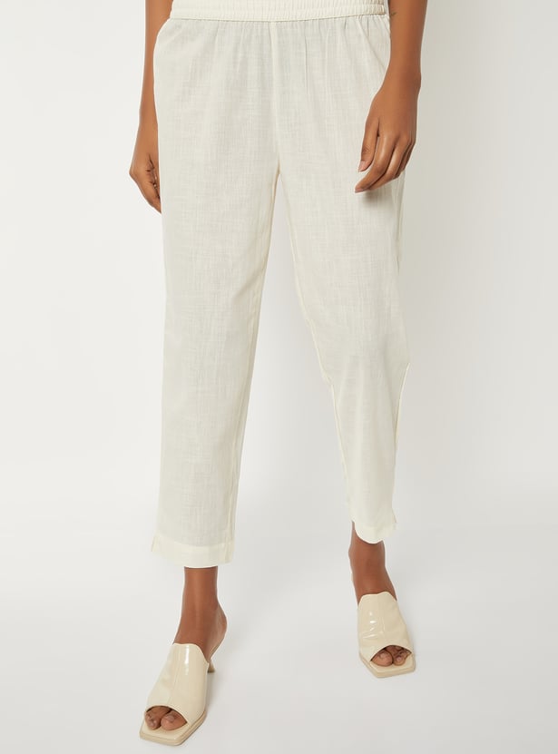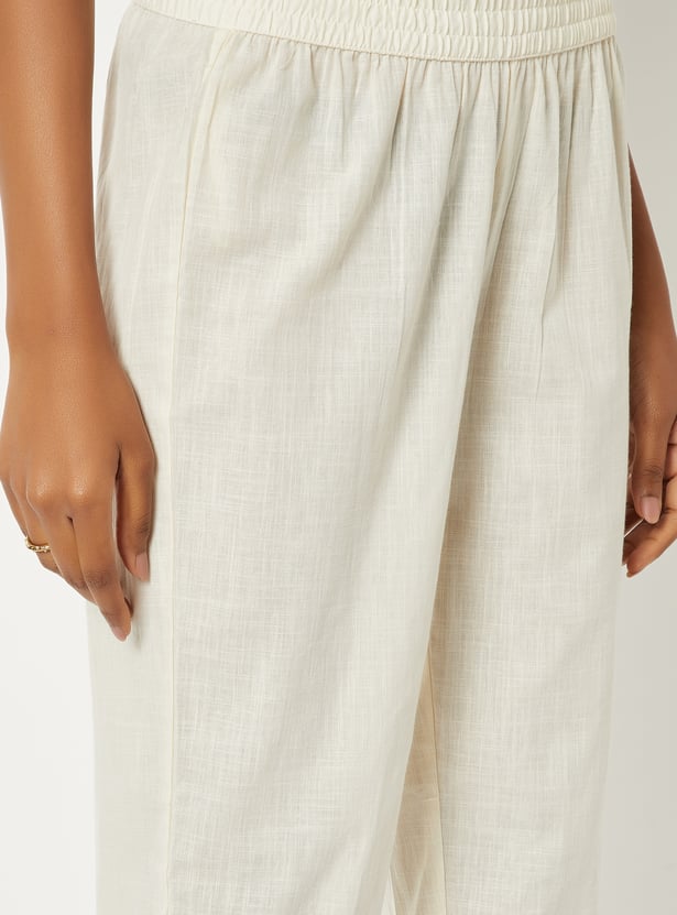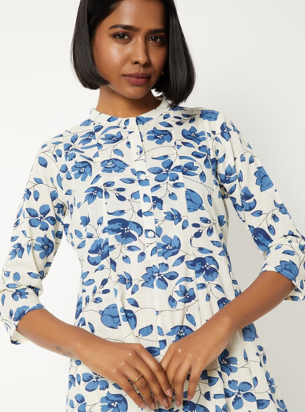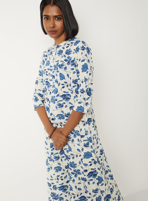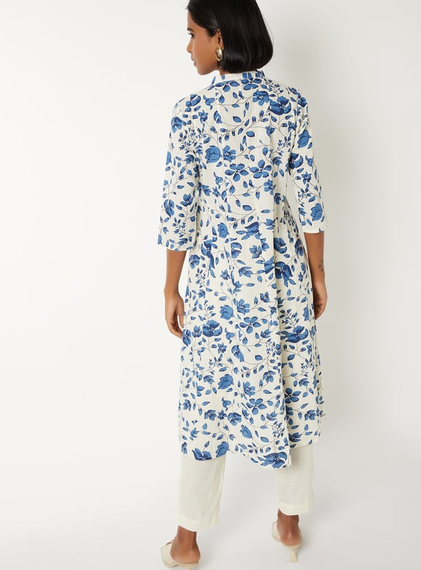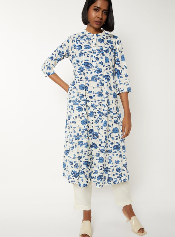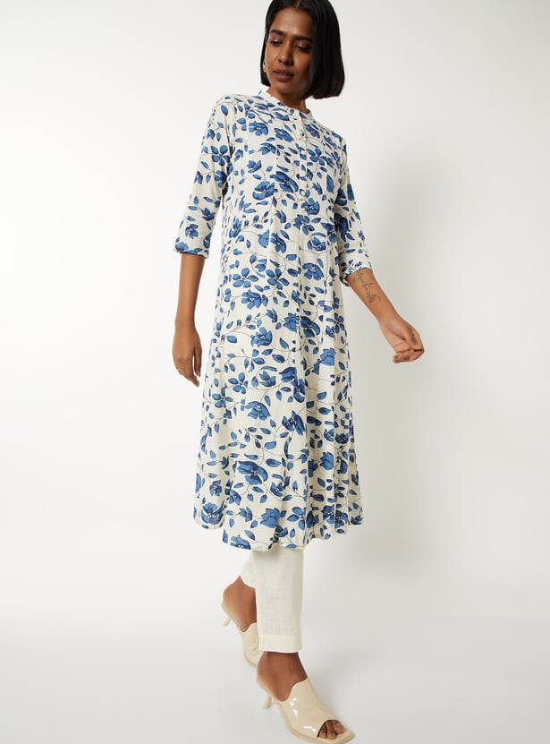 Freshen up your ethnic collection with this floral print A-line kurta set. The kurta features a band collar and 3/4th sleeves, offering a flattering and flowy silhouette. It’s paired with straight pants featuring an elasticated waist for all-day comfort.