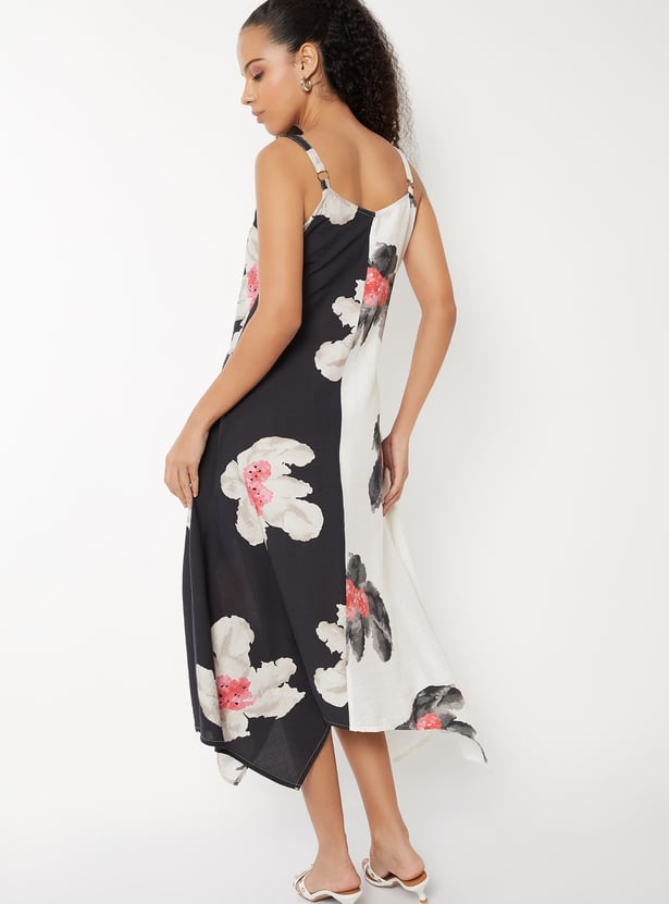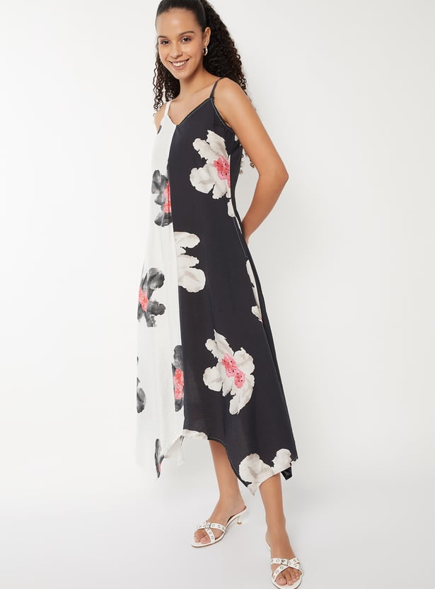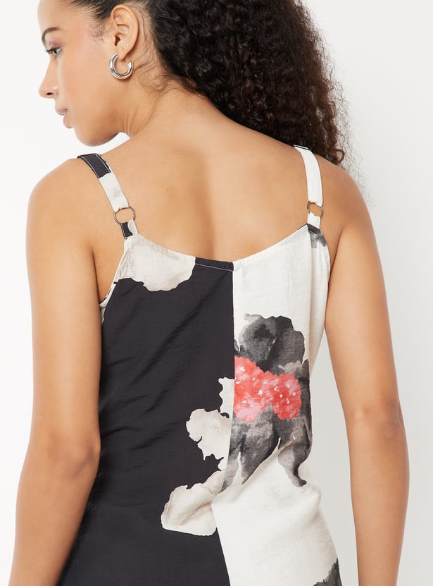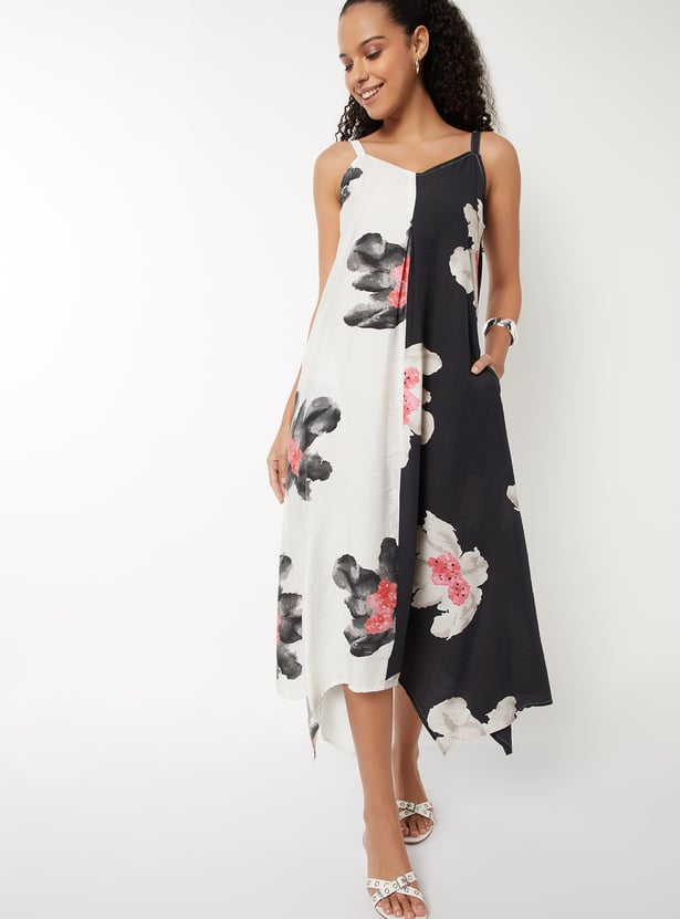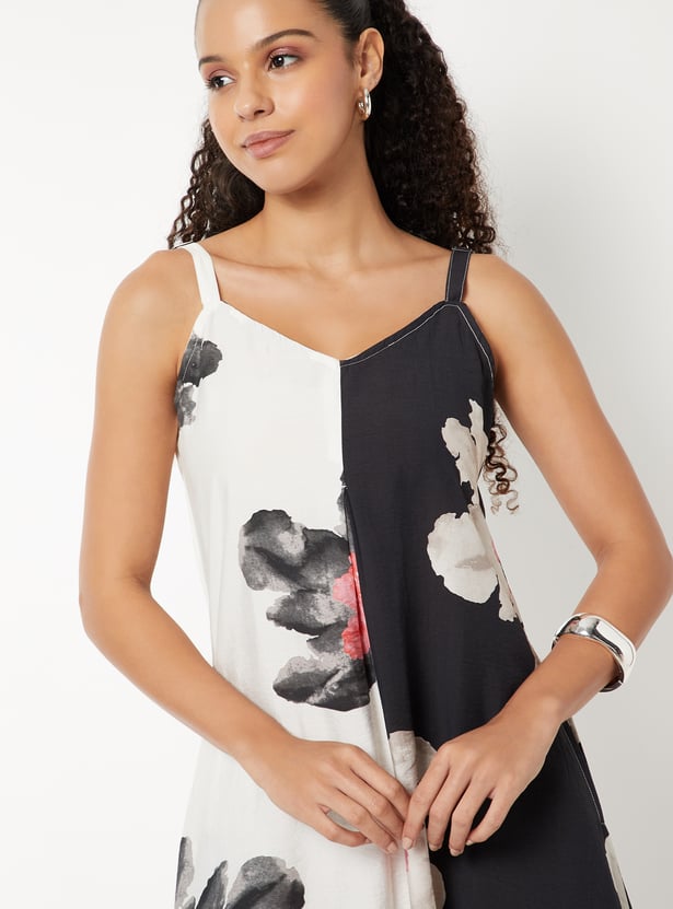 Turn heads in this printed midi dress featuring a romantic sweetheart neckline, shoulder straps, and an eye-catching asymmetric hem. Designed to flatter, it blends elegance with a playful twist.