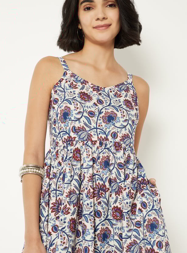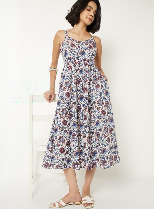 Add a chic touch to your wardrobe with this floral print A-line midi dress. Featuring a V-neck, shoulder straps, and a smocked back, it offers a flattering silhouette with effortless style.
