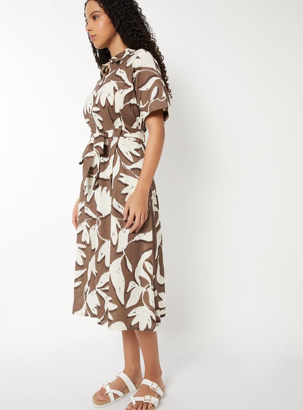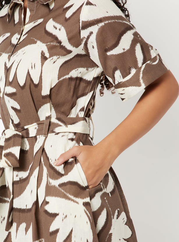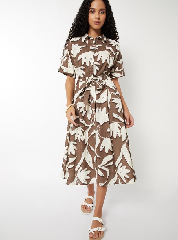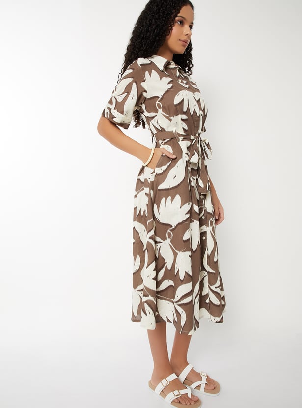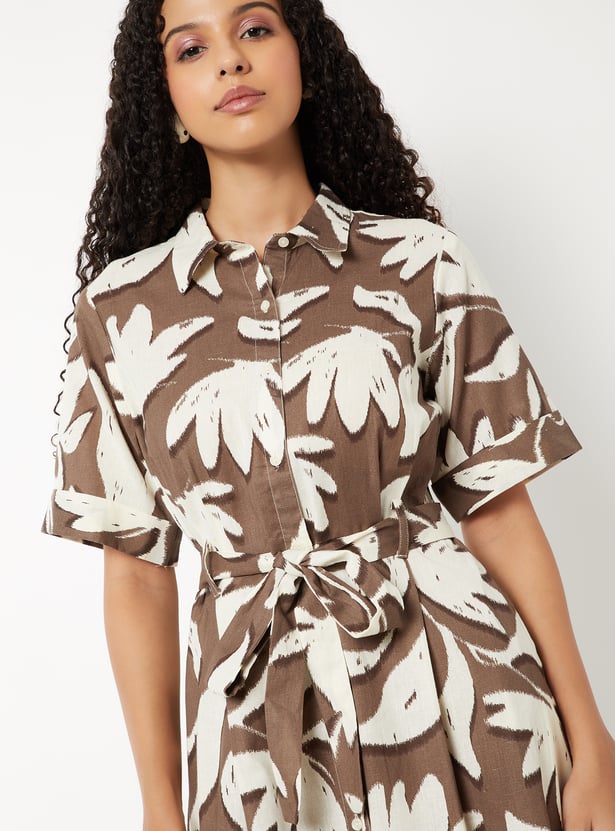 Women Floral Print Belted Shirt Dress