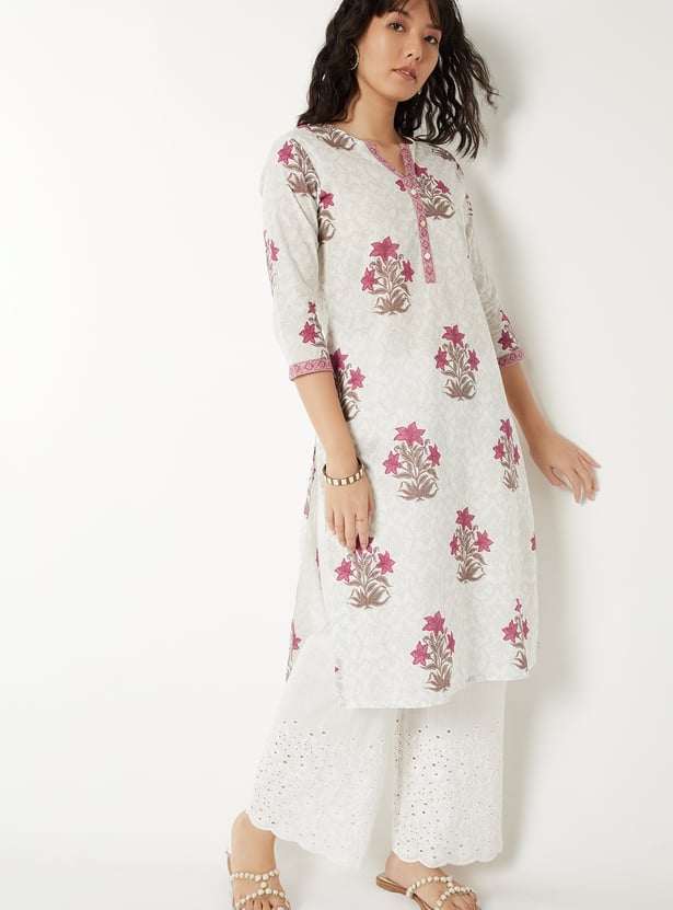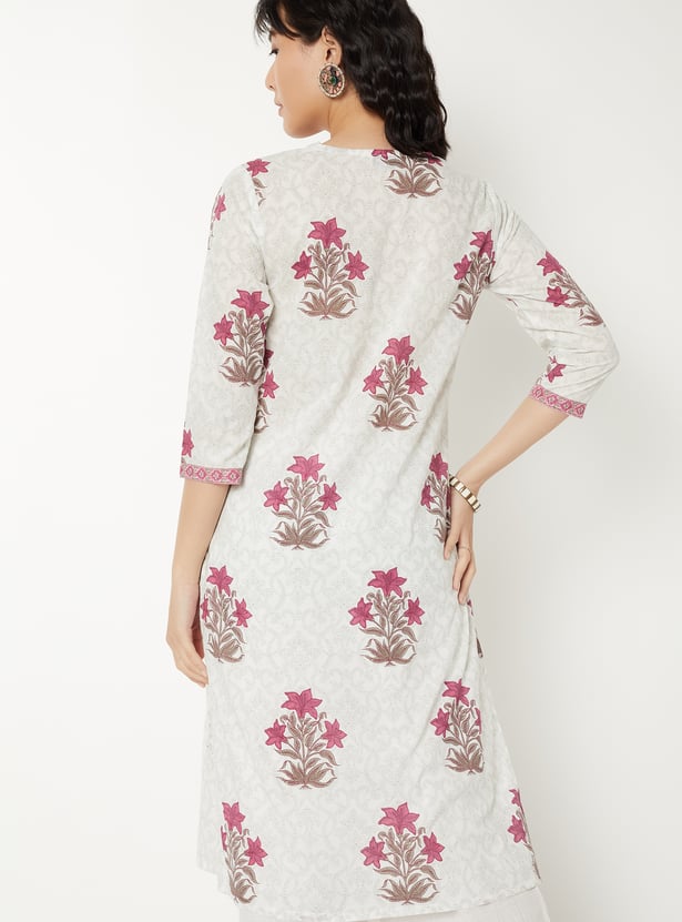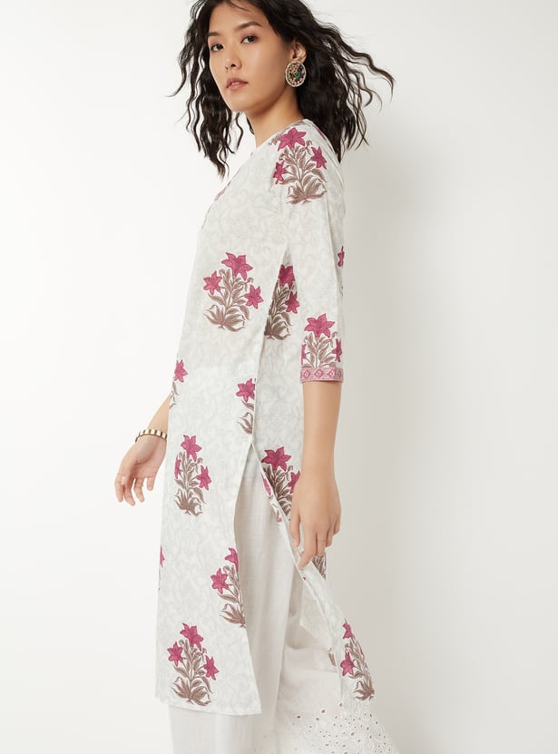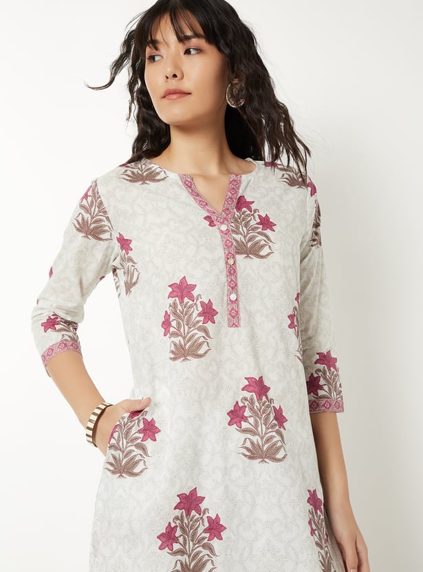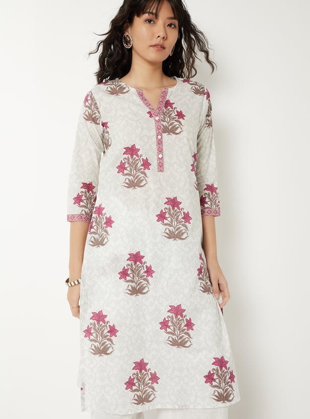 A graceful straight kurta adorned with a floral print, featuring a chic notched neck and three‑quarter sleeves with side slits for ease of movement. Finished with a practical pocket, it blends everyday comfort with effortless elegance.