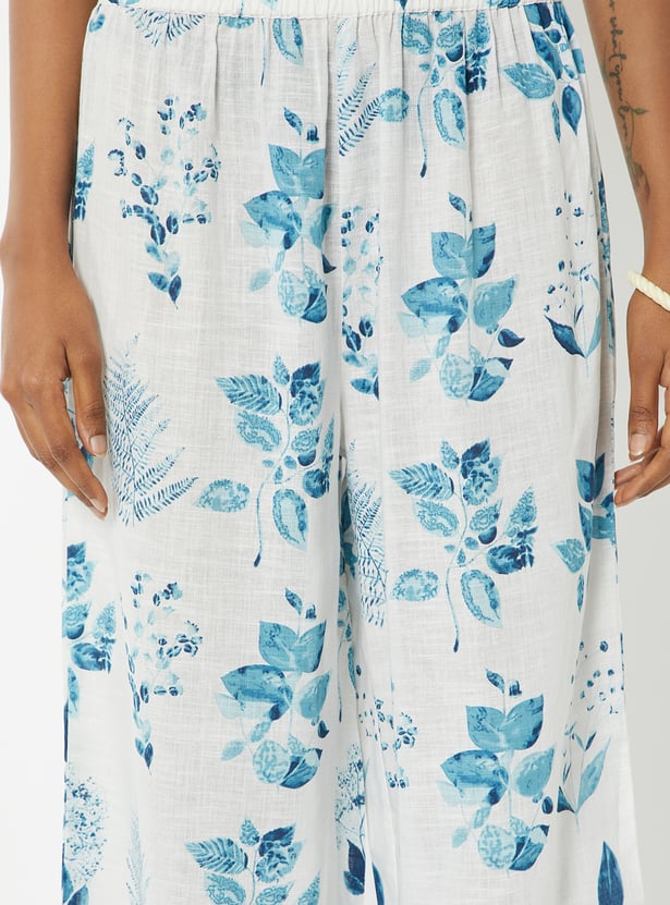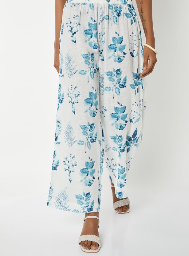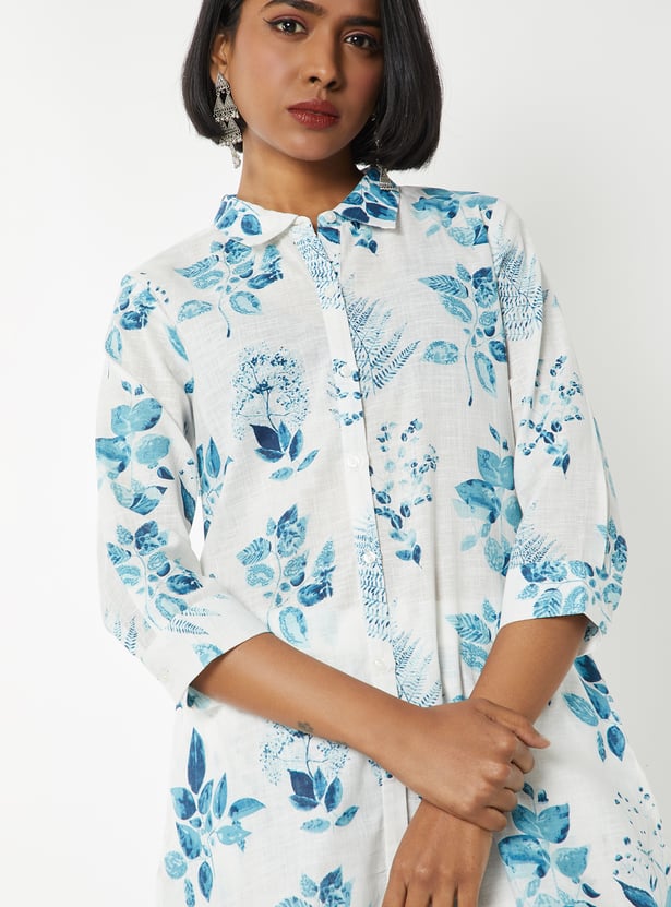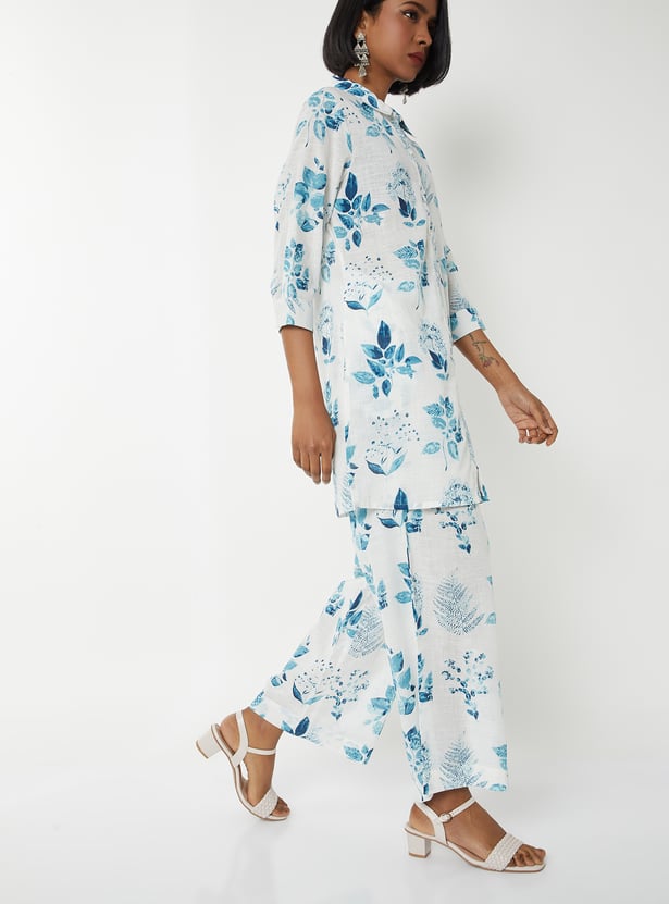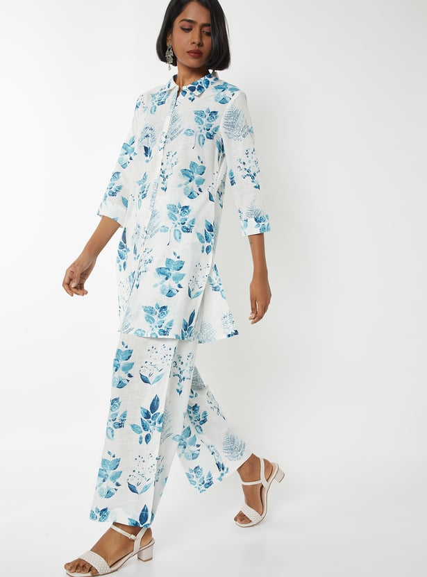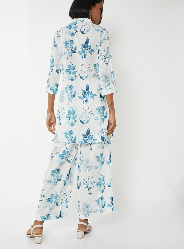 Step out in elegant charm with this floral print straight kurta set. The kurta features a band collar, button closure, side slits, and 3/4th sleeves for a stylish touch. It is paired with palazzos with an elasticated waist for all-day comfort.