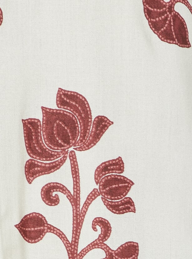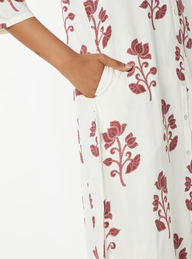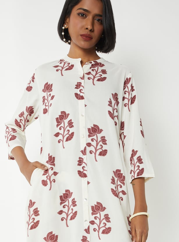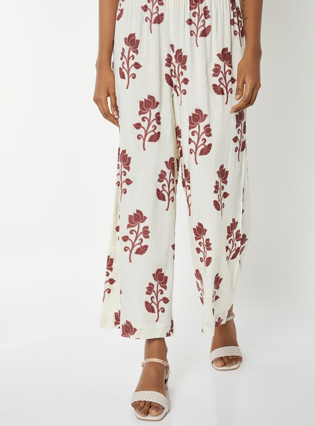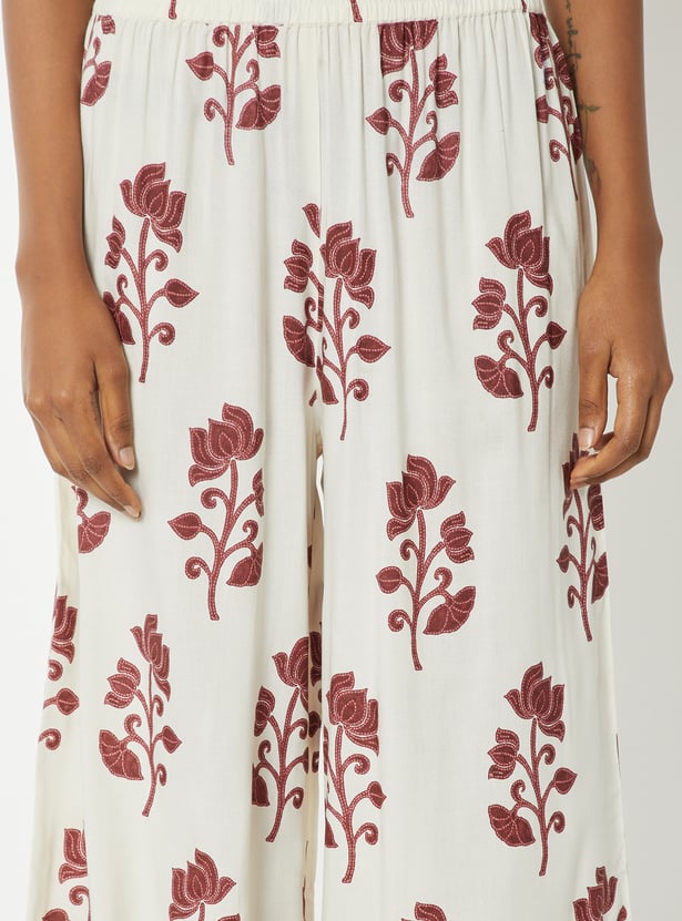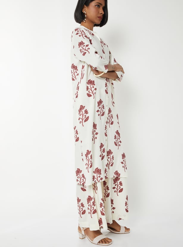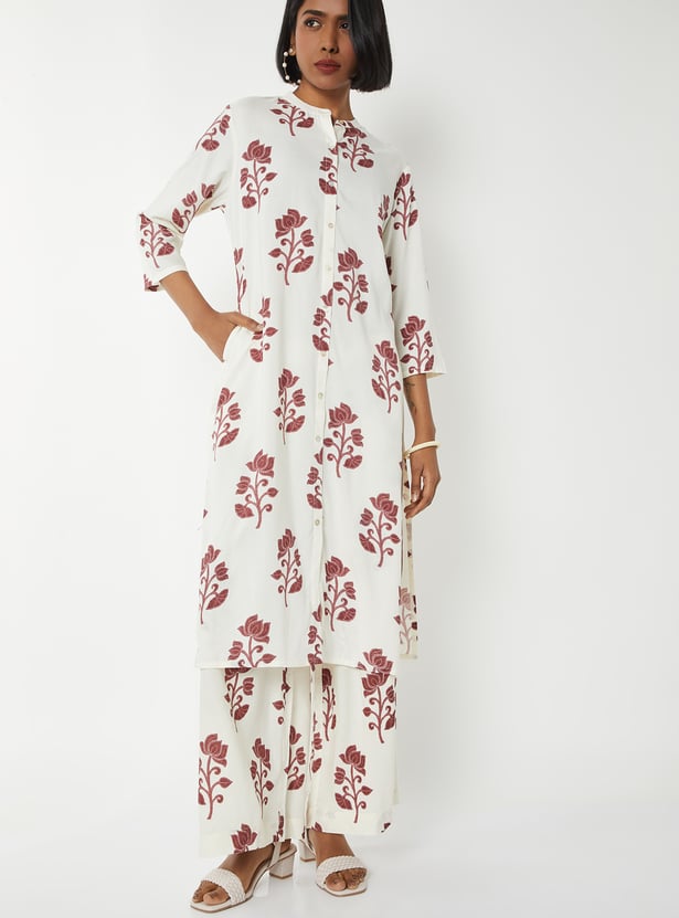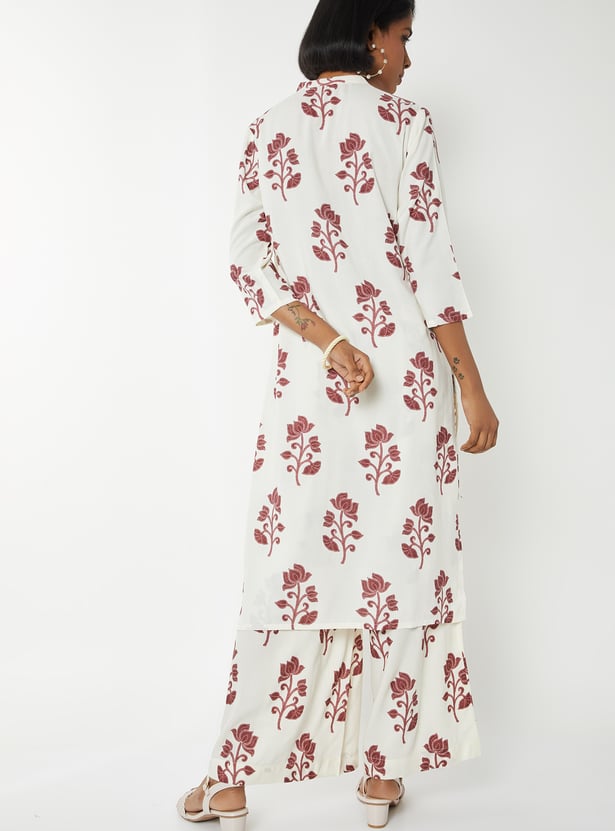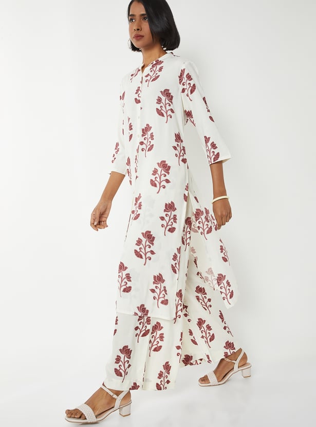 Step out in graceful style with this floral print straight kurta set. The kurta features a band collar, 3/4th sleeves, side pocket, and side slits for ease. It is paired with palazzos with an elasticated waist for all-day comfort.