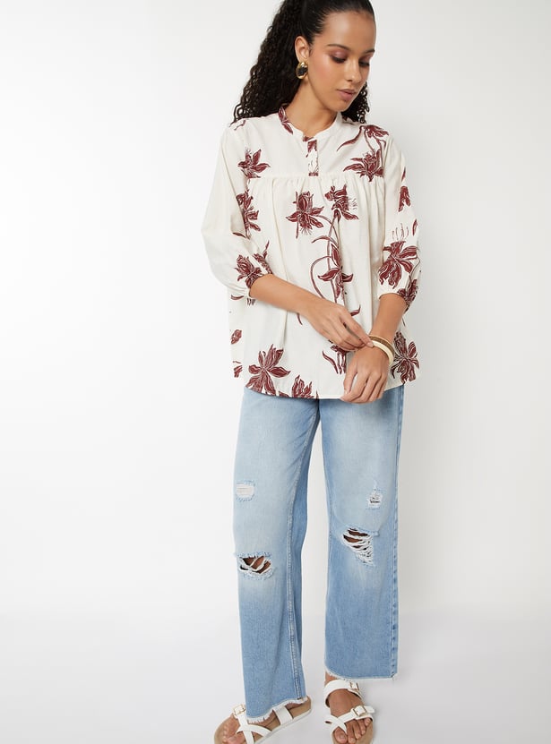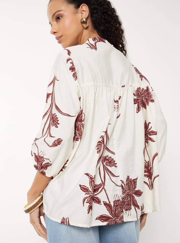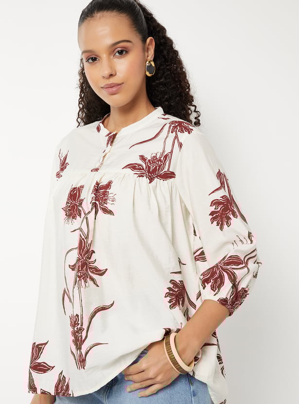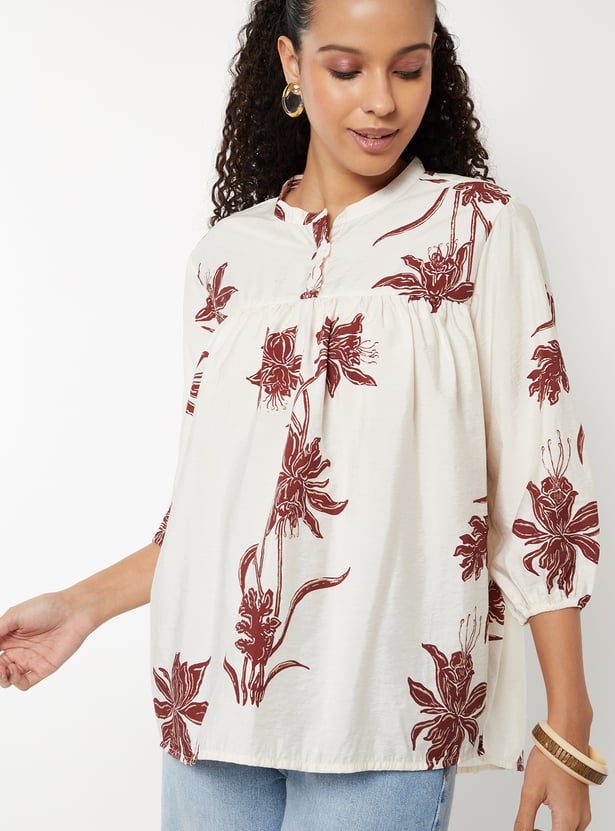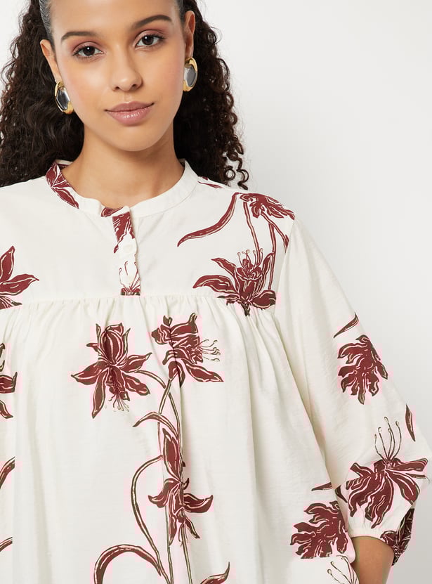 Brighten up your everyday look with this floral print tunic, featuring a band collar, button placket, and 3/4th sleeves. The breezy silhouette makes it perfect for both work and casual wear.
