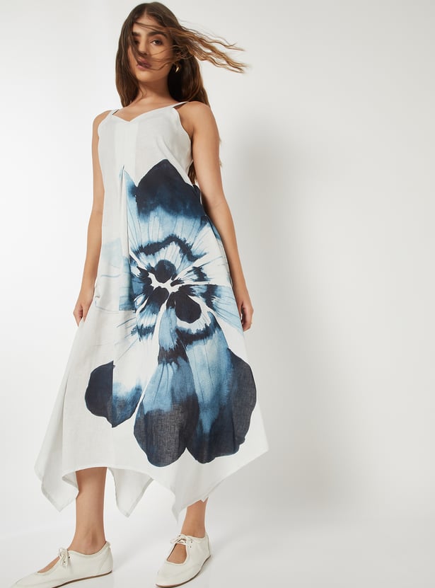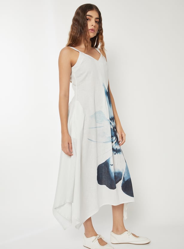 Light up your contemporary couture in this sleeveless A-Line dress that is designed with intricate floral printed designs and a V-neck with shoulder straps to cast the perfect impression.