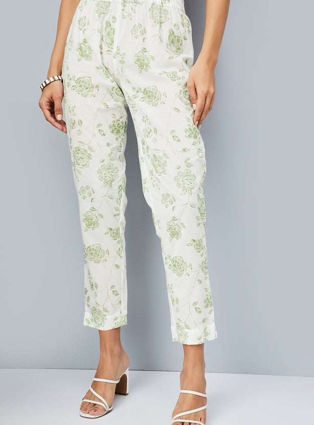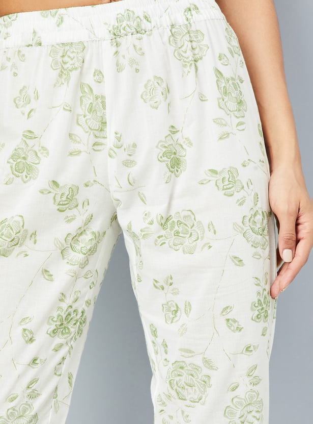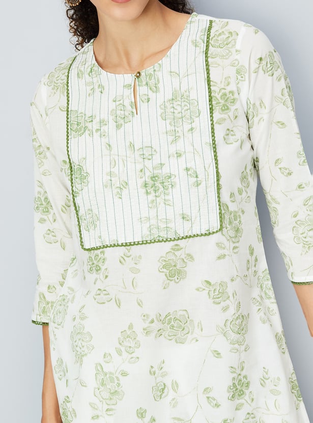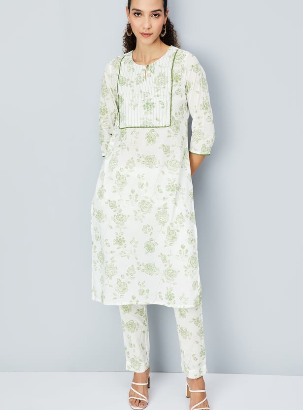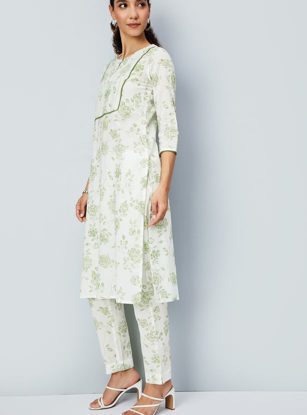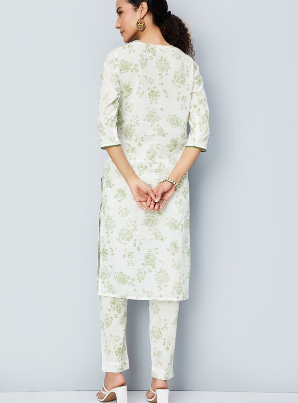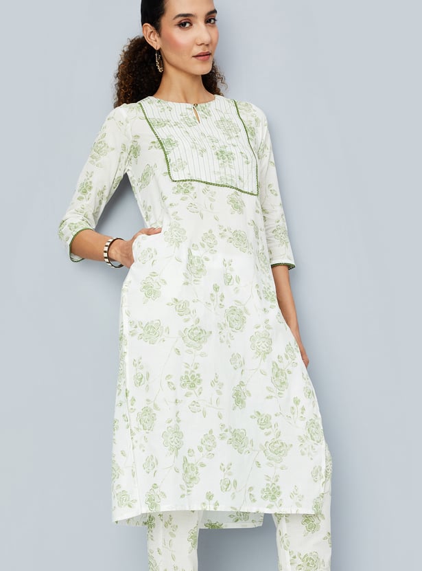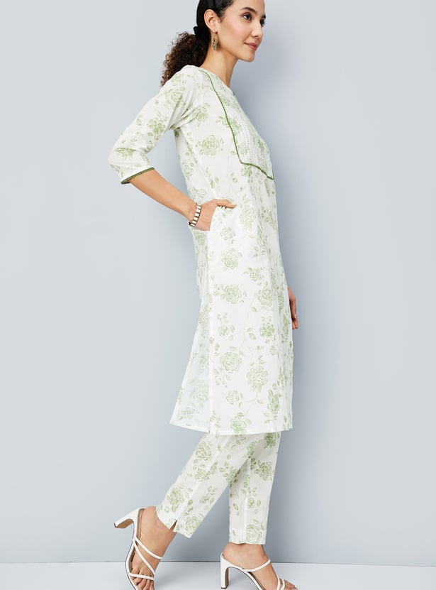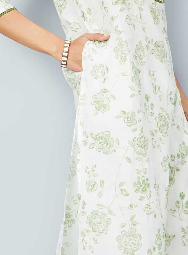 Flaunt elegance in this vibrant floral print kurta set, designed with a keyhole neck, three-quarter sleeves, pockets, and a flattering calf-length silhouette. Paired with comfortable straight pants featuring an elasticated waistband, it blends traditional charm with modern style.