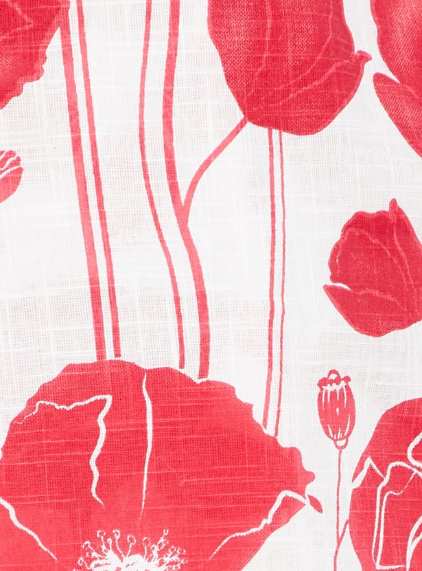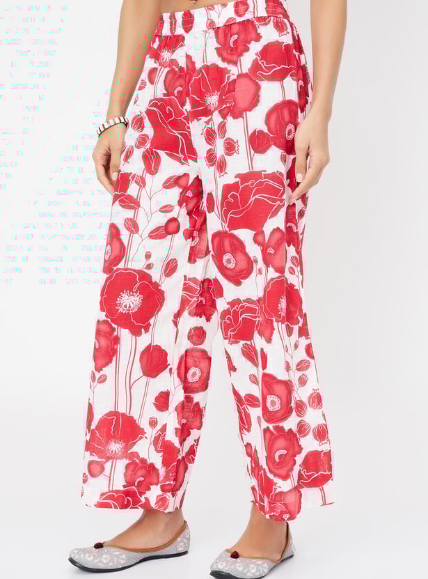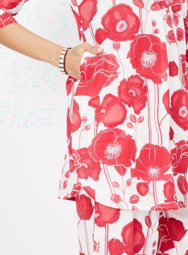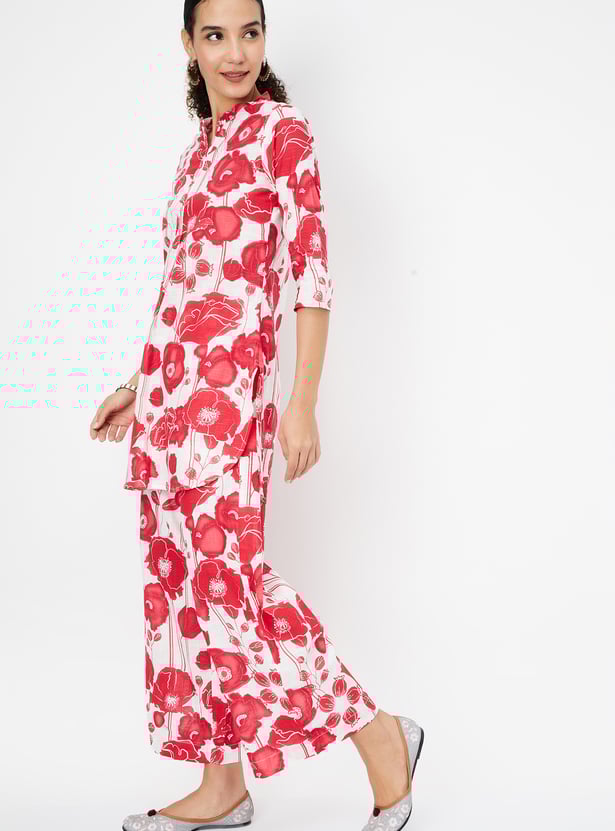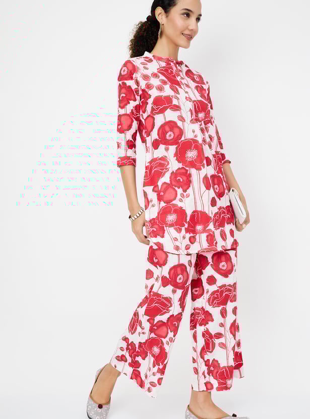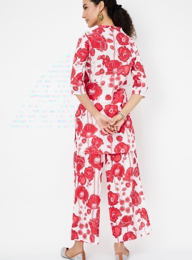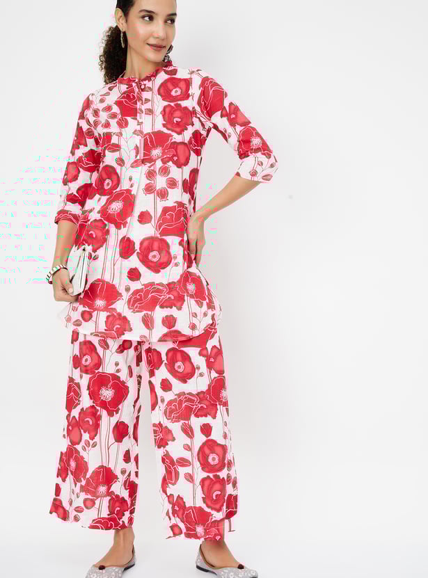 Elevate your ethnic wardrobe with this floral-printed straight kurta set. The kurta features a band collar, three-quarter sleeves, and a curved hem for a refined look. Paired with comfortable palazzos designed with an elasticated waistband, this set offers a perfect blend of style and ease for any occasion.
