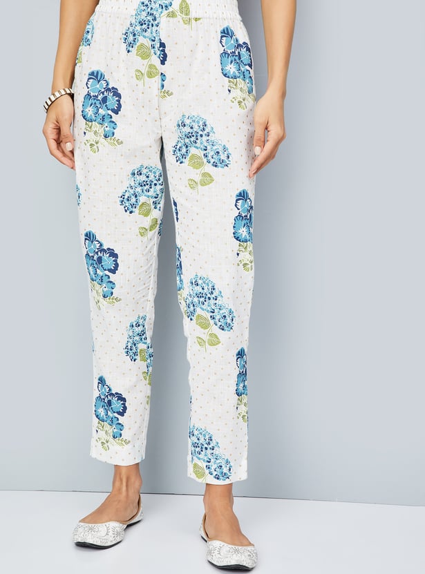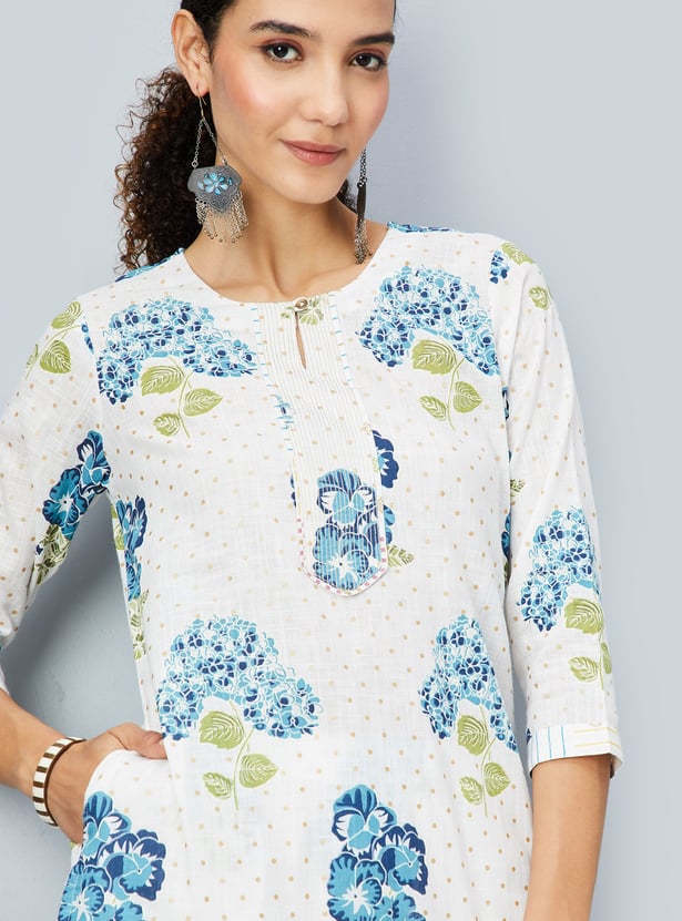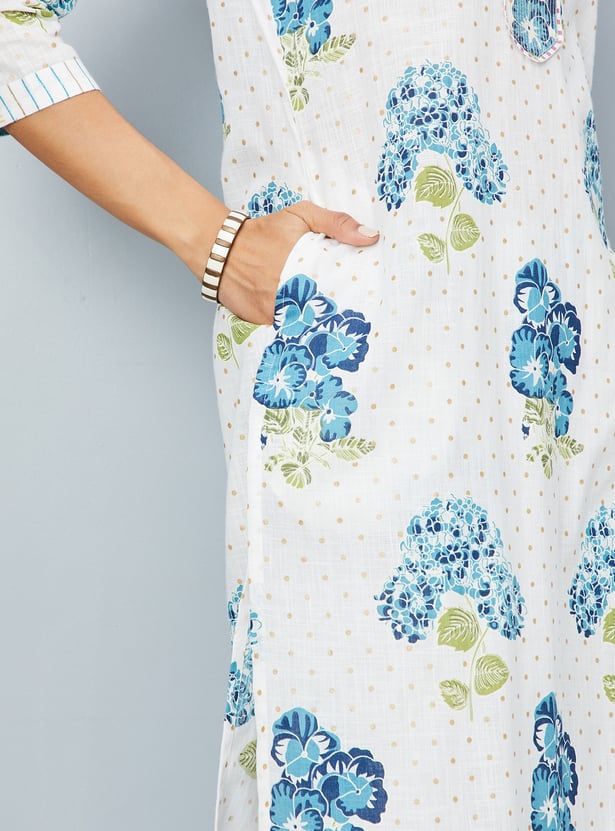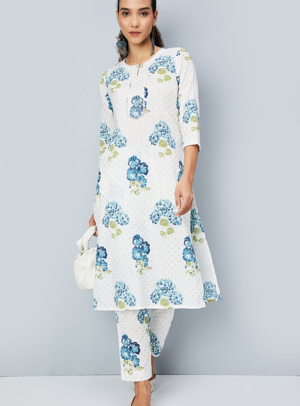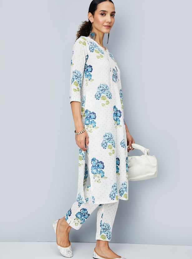 Flaunt timeless elegance with this kurta set, adorned with a vibrant floral print. The kurta features a keyhole neck, three-quarter sleeves, and convenient pockets, all styled in a flattering calf-length silhouette. Complemented by straight pants with an elasticated waistband, this set effortlessly blends traditional charm with contemporary sophistication, making it perfect for any occasion.
