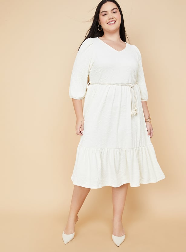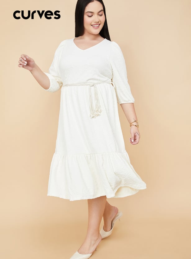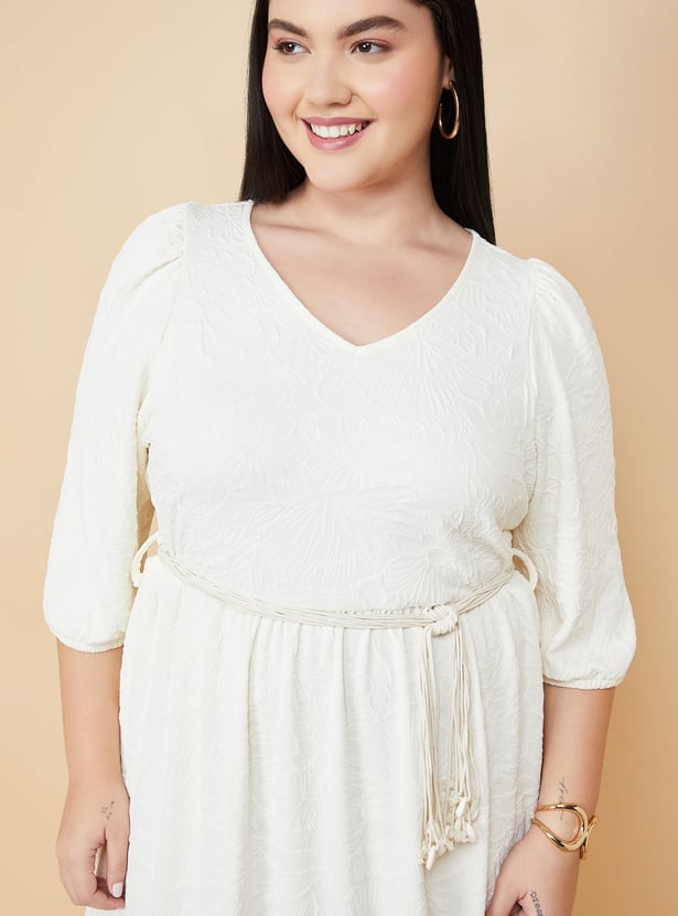 Embrace effortless elegance with this floral textured midi dress, featuring a flattering V-neckline, 3/4th sleeves, a flounce hem, and a matching belt to cinch the waist. Perfect for day-to-evening transitions. Model Size :