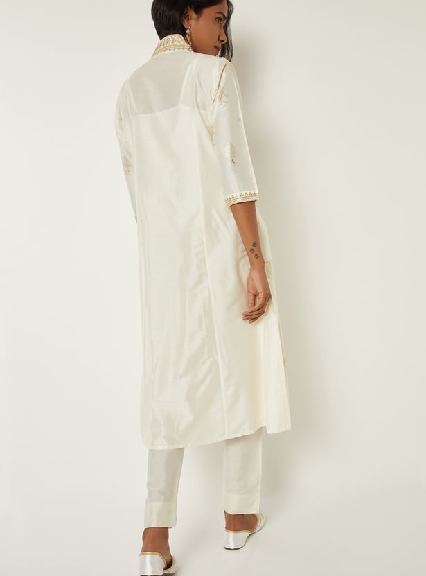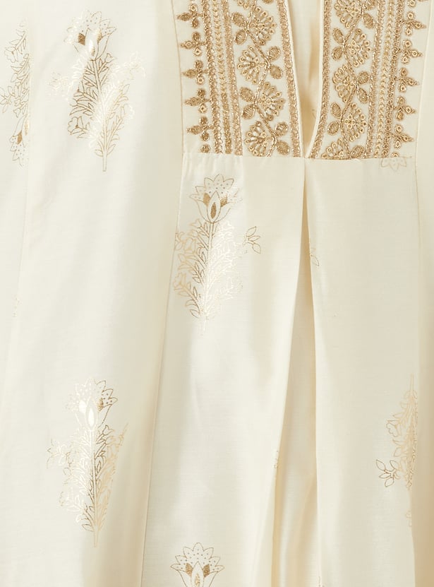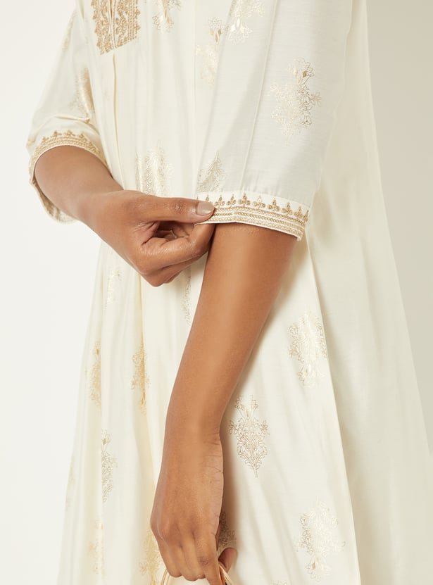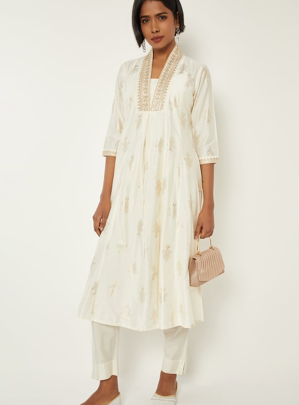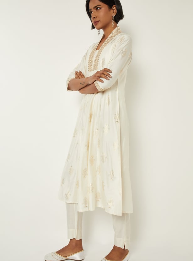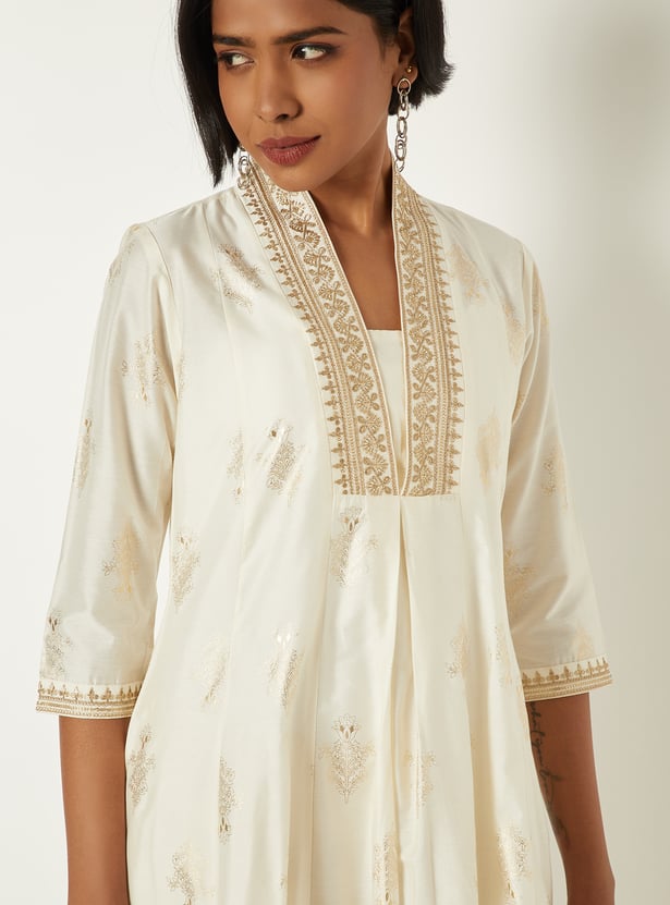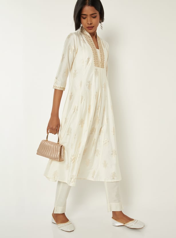 Shimmer with elegance in this foil‑printed Kalidar kurta, featuring an embroidered neck design and three‑quarter sleeves. The flowing silhouette adds grace, while the intricate detailing makes it perfect for festive occasions or chic everyday wear.