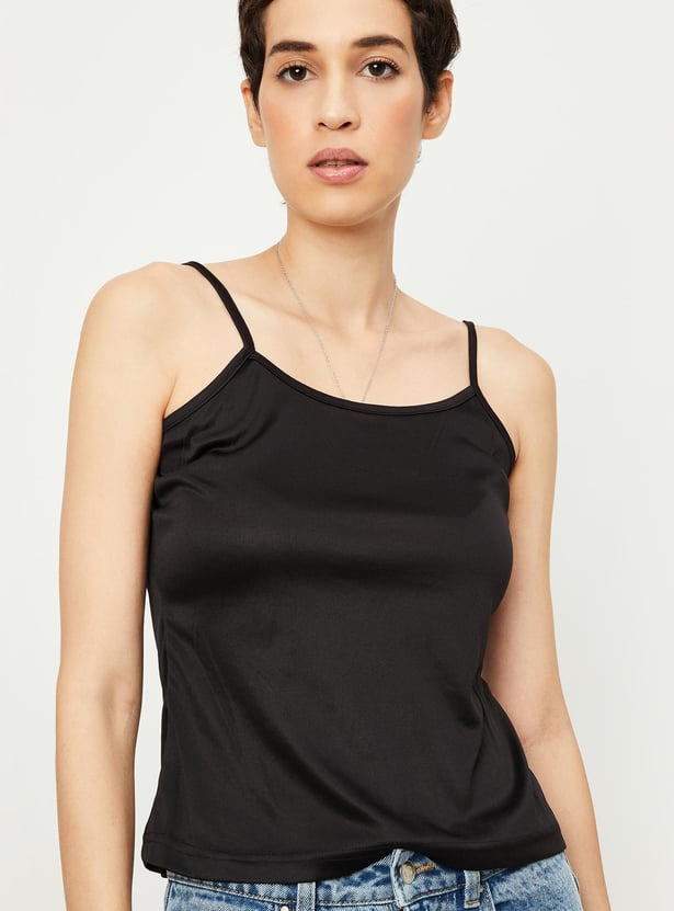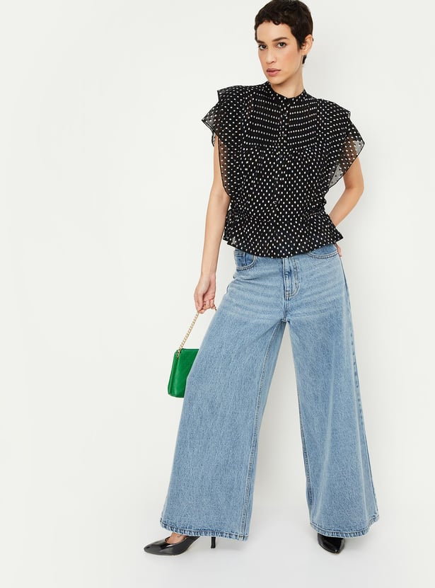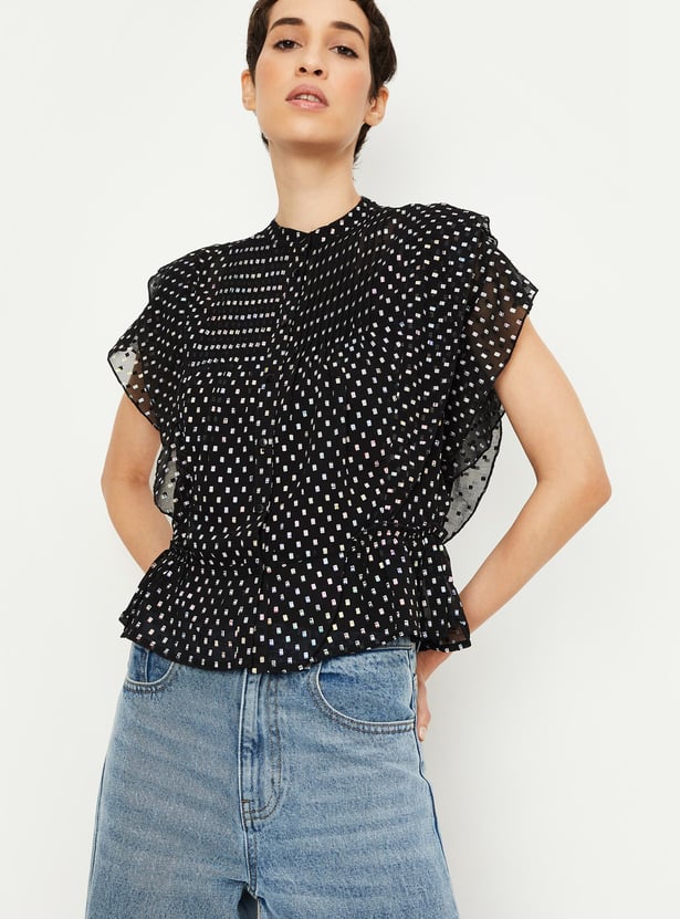 This holographic-printed top with a band collar, flutter sleeves, a button placket, and an elasticized feature above the hem will upgrade your casual wardrobe. It comes with a solid camisole.