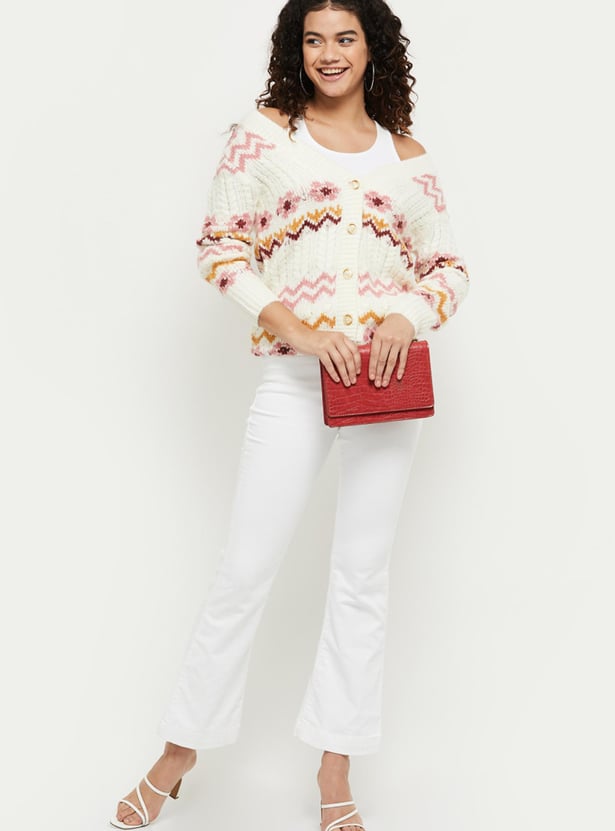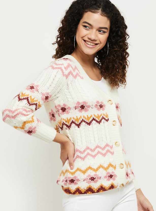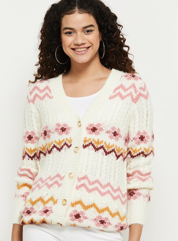 Upgrade your wardrobe this winter season with this textured cardigan designed with a V-neckline, button placket, pockets, long silhouette, and full sleeves. Pair it up with a pair of shaded jeans and boots to ensemble your entire look.