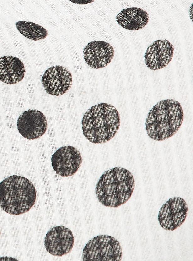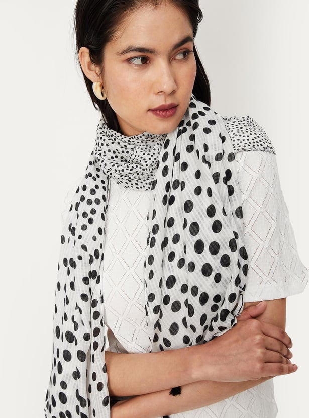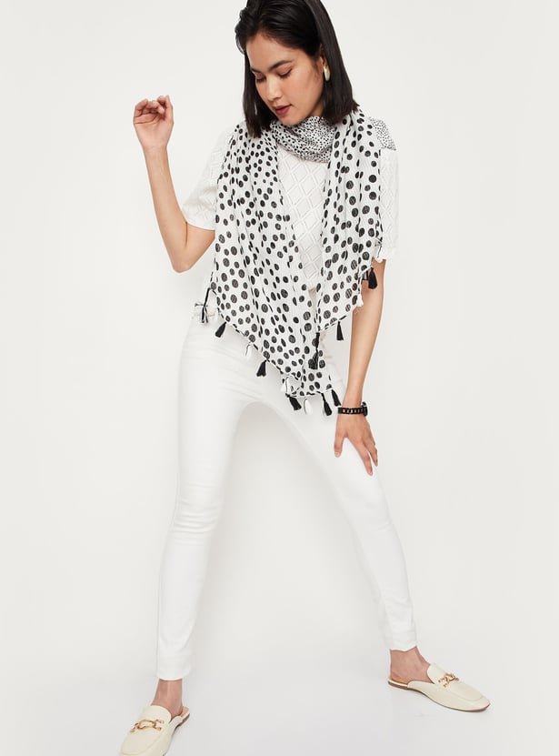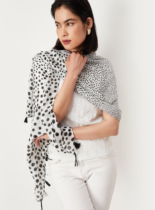 Add a chic twist to your outfit with this scarf. It is highlighted with polka dot prints, tassel ends, and a dobby woven design. Layer this scarf over a top and jeans to transform your style.
