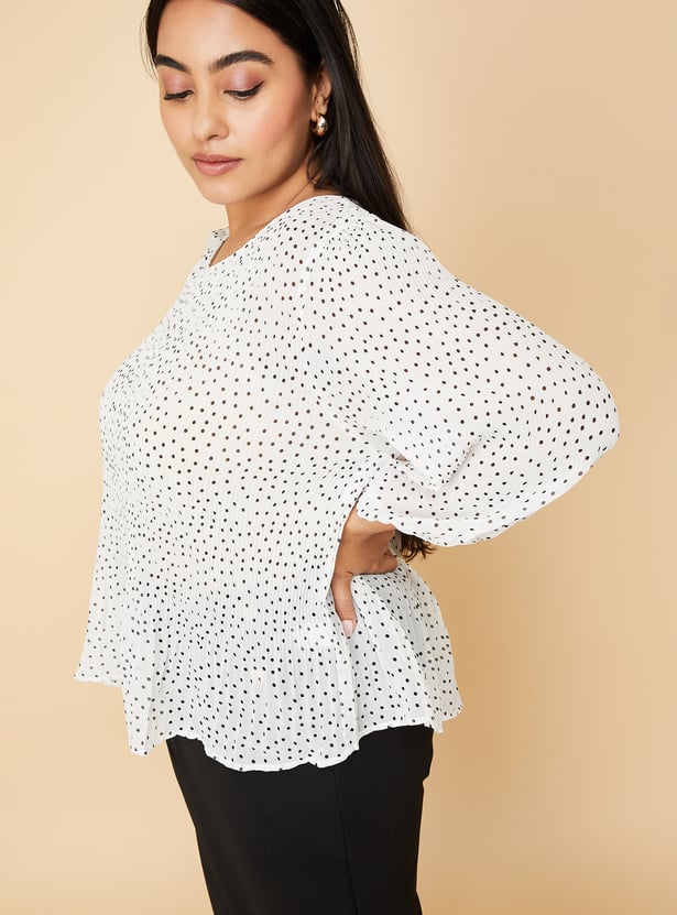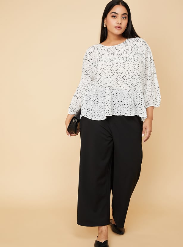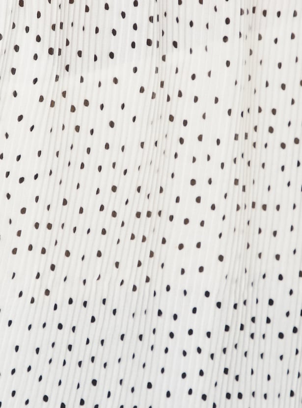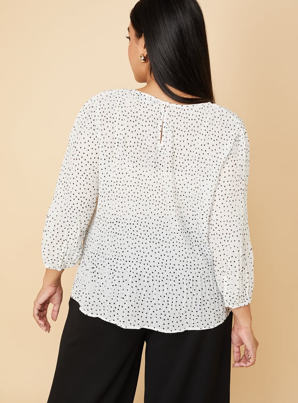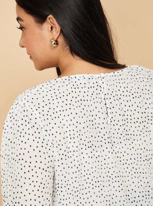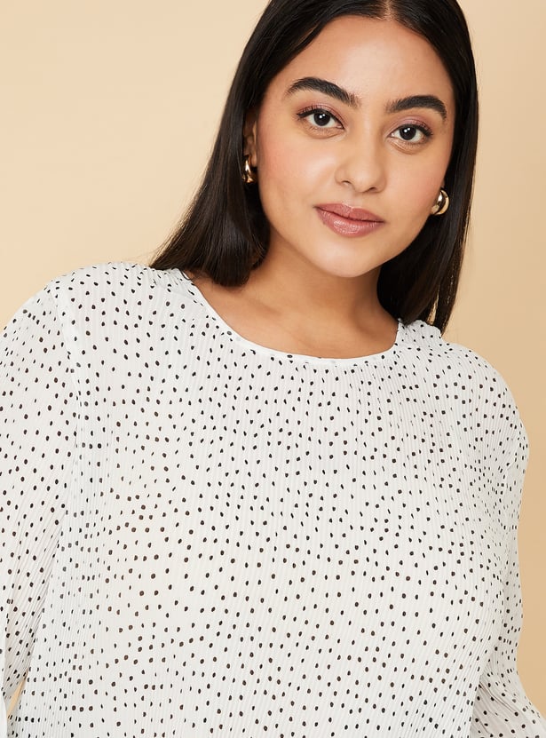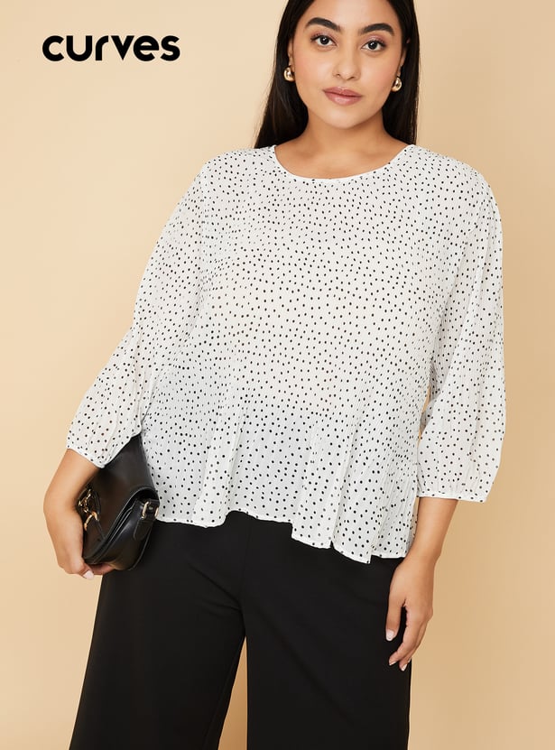 Team this top with tailored trousers and pumps for an elevated look. It is highlighted with a pleated design and polka dots for a classic look. This top is styled with a round neck, three-quarter sleeves, and a flared hem. Model Size :
