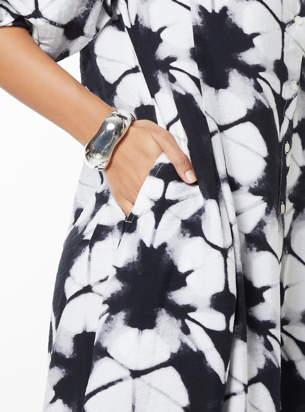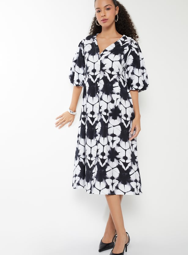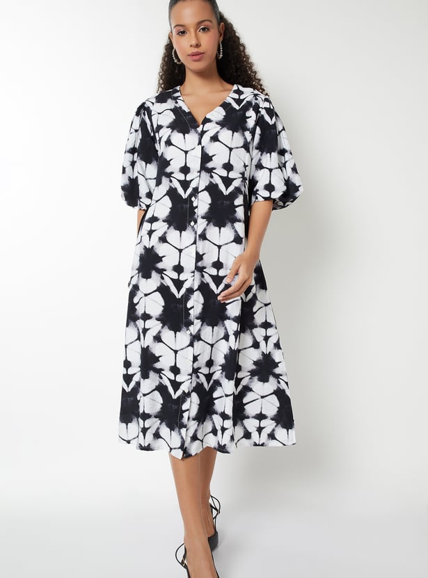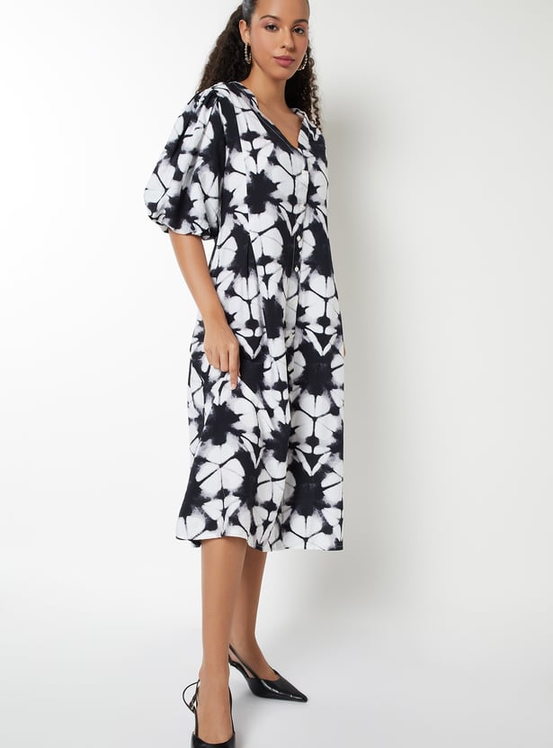 Bring effortless charm to your wardrobe with this printed A-line dress, featuring a flattering v-neck and puffed half sleeves. The knee-length silhouette offers a classic yet playful feel.
