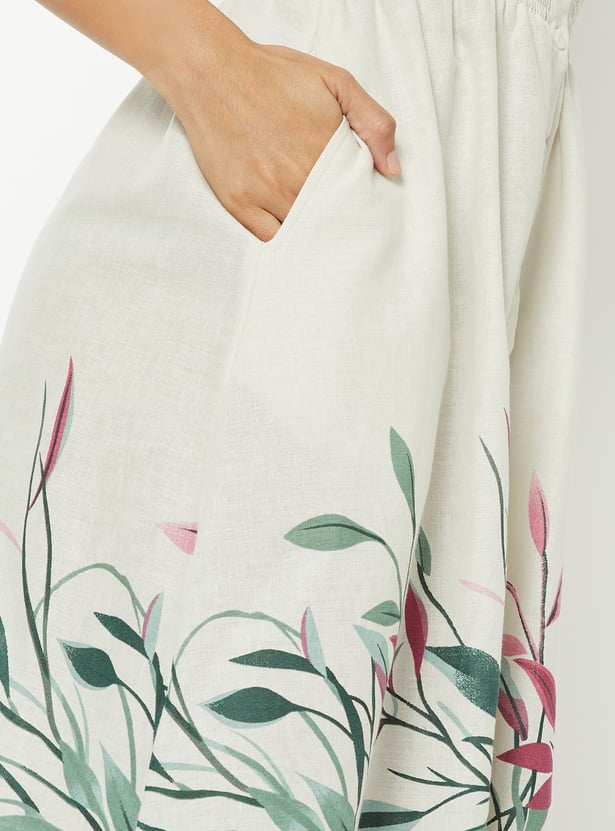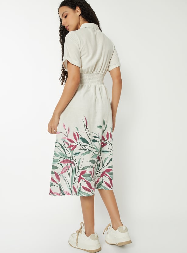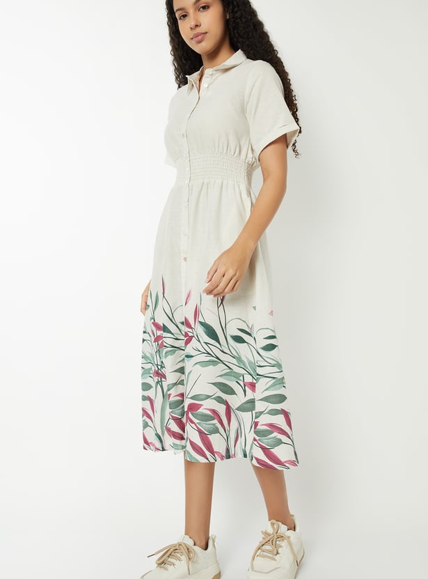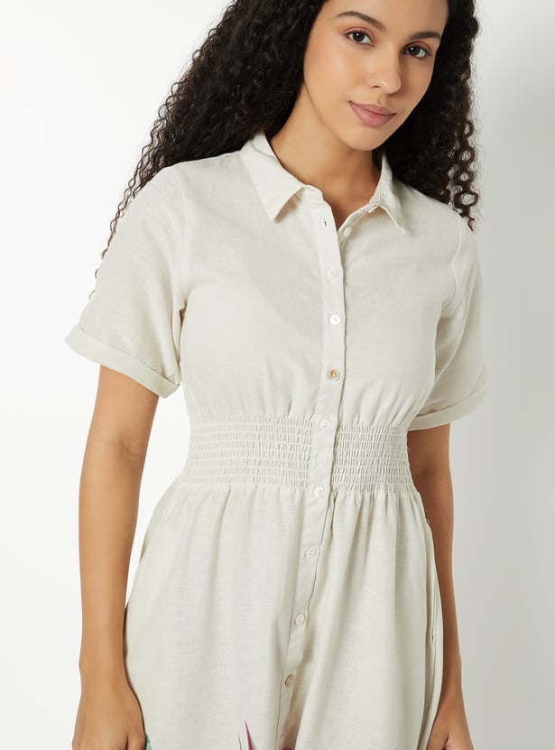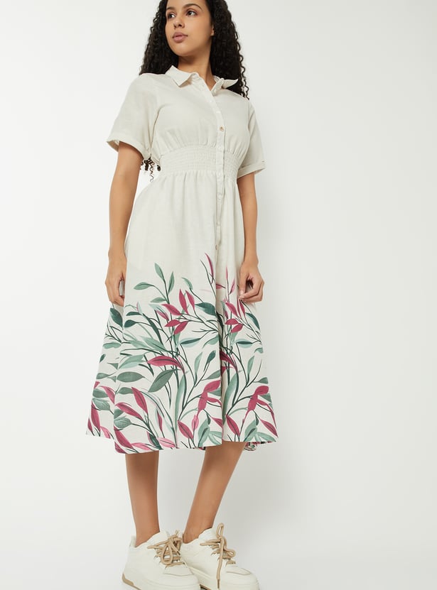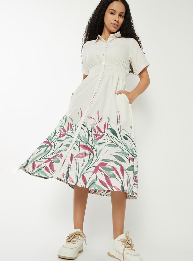 This placement-printed half-sleeve dress features a refined spread collar and a neat button-down front that frames the look with polish. The smocked waist adds flattering shape while keeping the silhouette effortlessly comfortable.