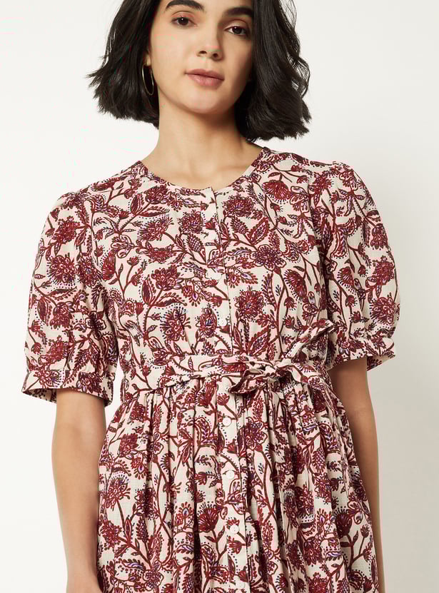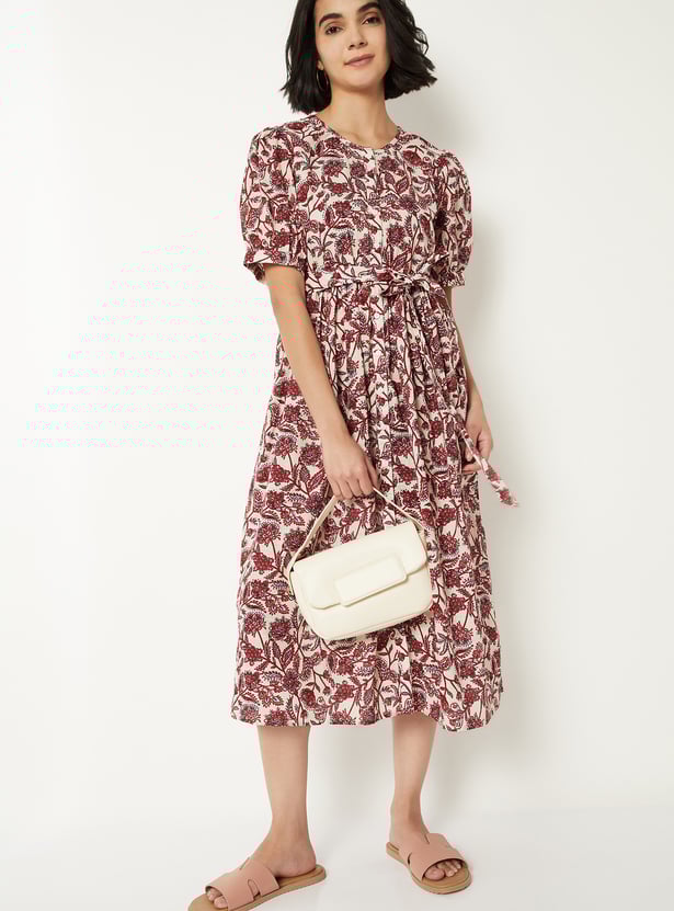 Add a charming touch to your wardrobe with this printed midi dress. Featuring puff sleeves, a practical side pocket, and coming with the tie-up belt, it combines playful detailing with everyday functionality.