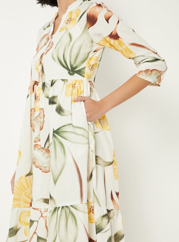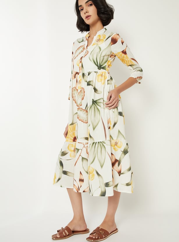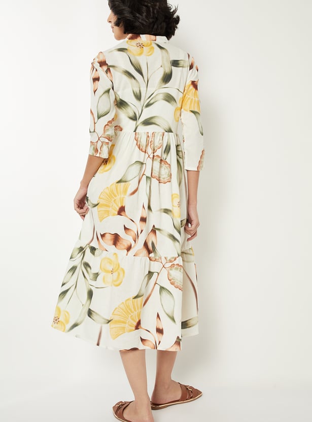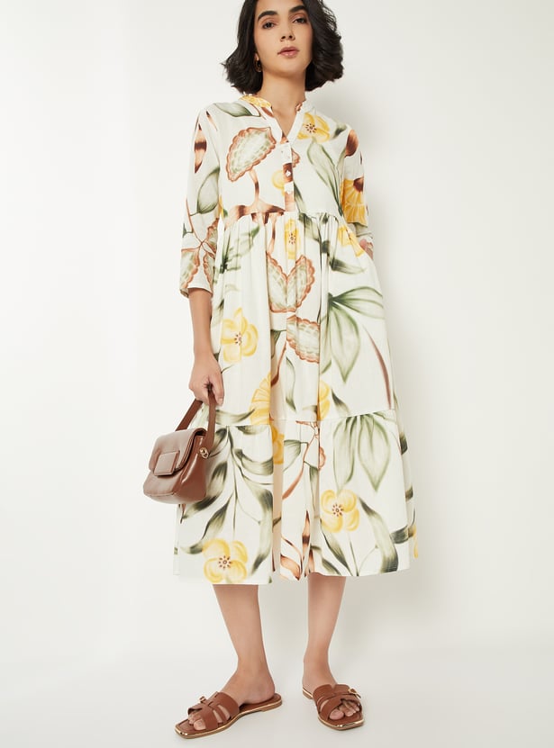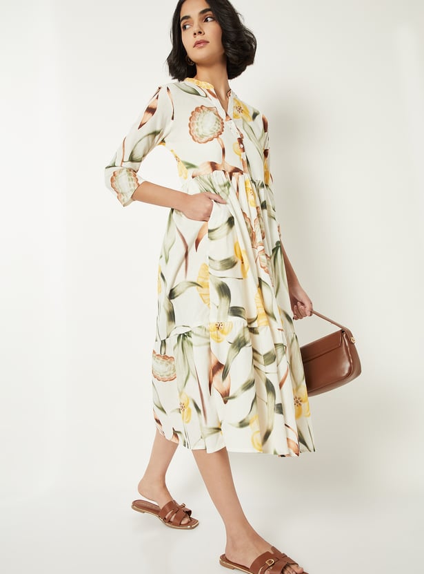 Add a touch of elegance with this printed A-line dress. Featuring a spread collar, button placket, half sleeves, side pocket, and a flattering midi length, it combines comfort with refined style.