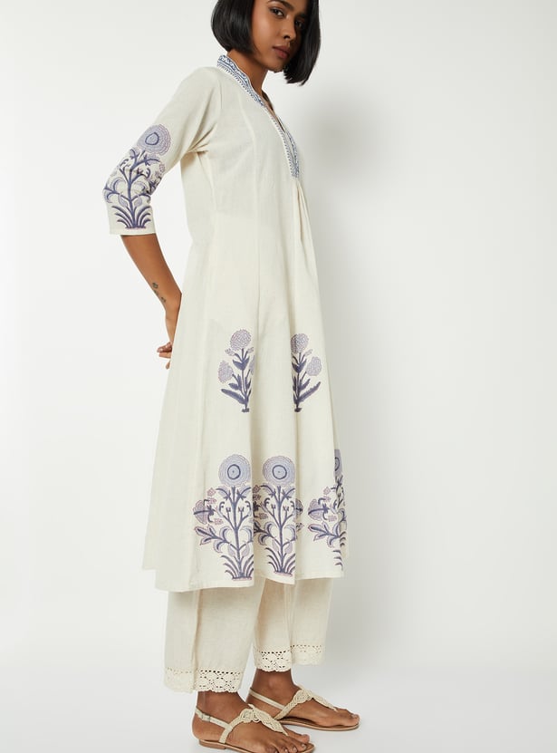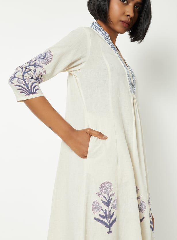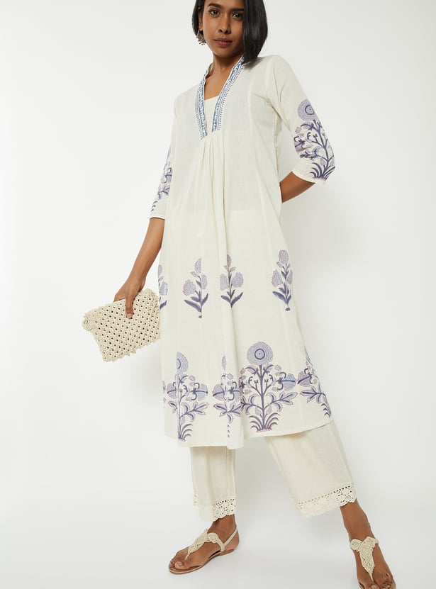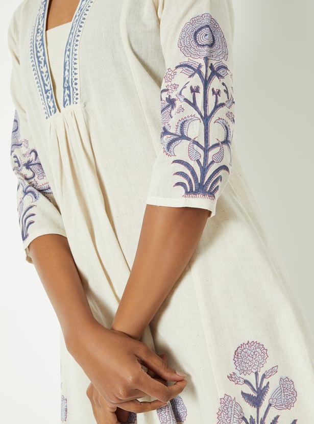 This printed A-line kurta features a V-neckline, 3/4th sleeves, and a panelled body that enhances its flattering shape. Designed with a convenient side pocket, it blends everyday ease with graceful detailing.