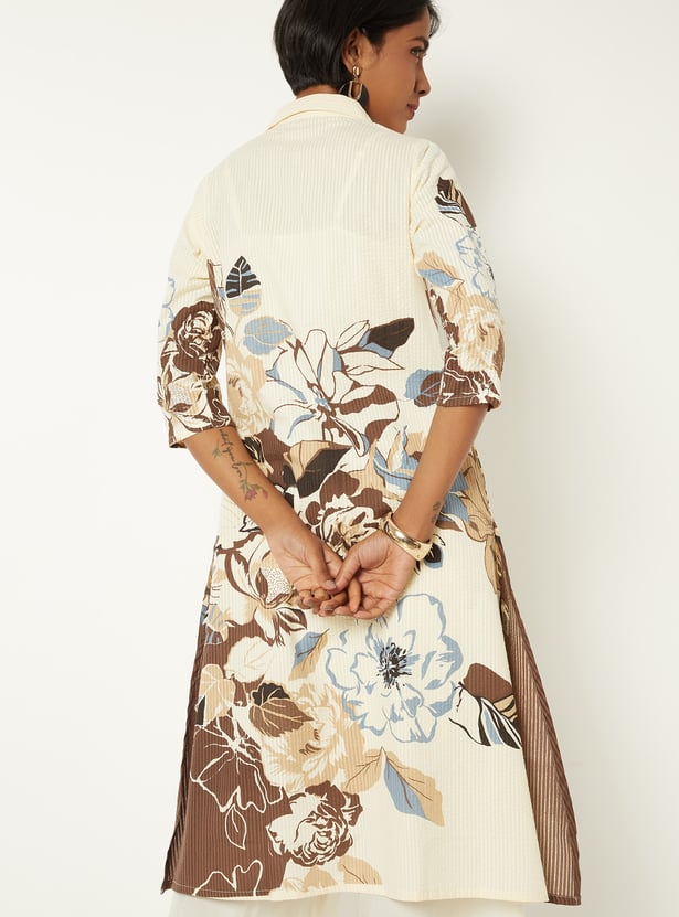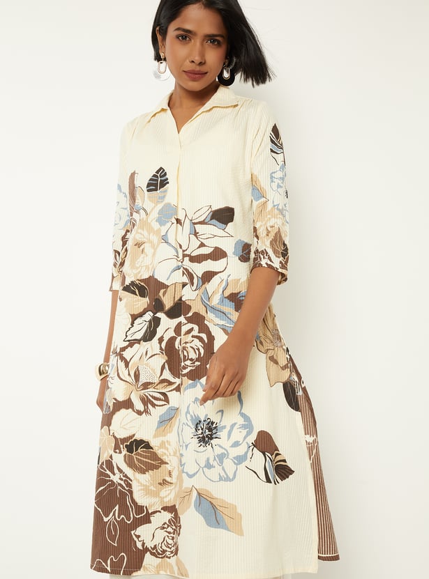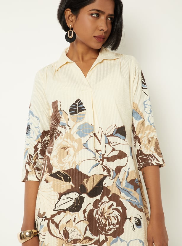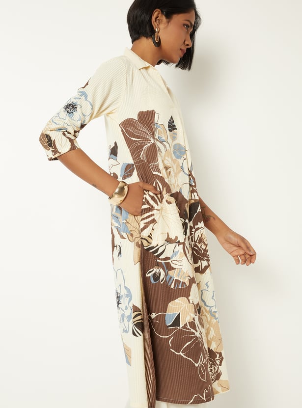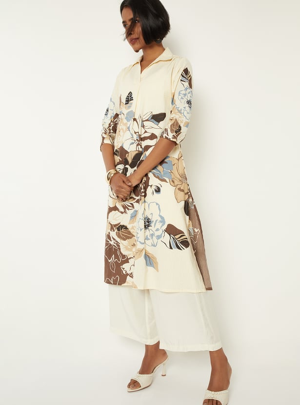 This printed A-line kurta features a spread collar neckline and 3/4th sleeves for a structured yet easy silhouette. Finished with a functional side pocket, it offers practical comfort with polished styling.