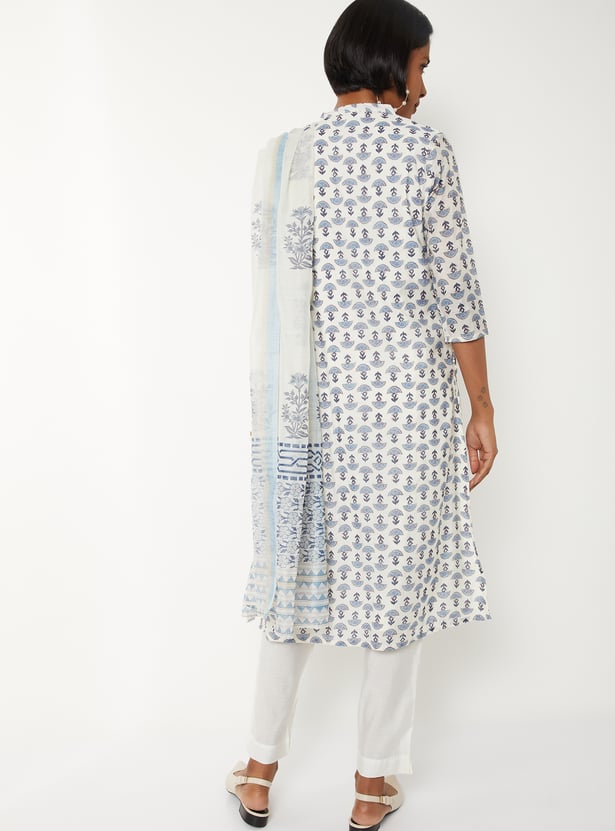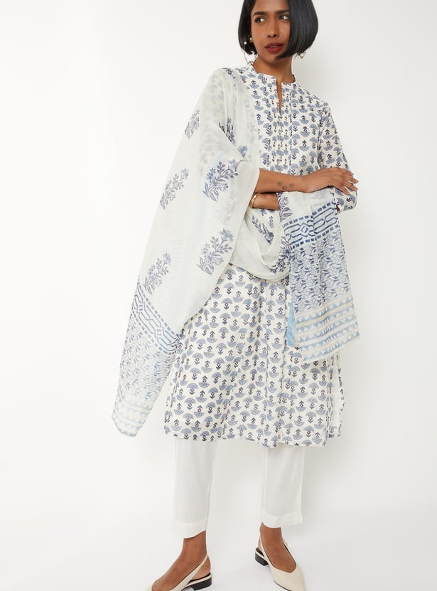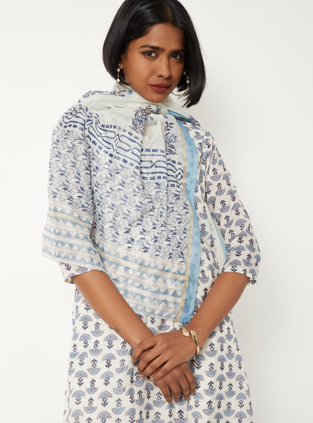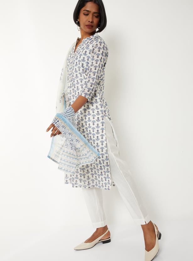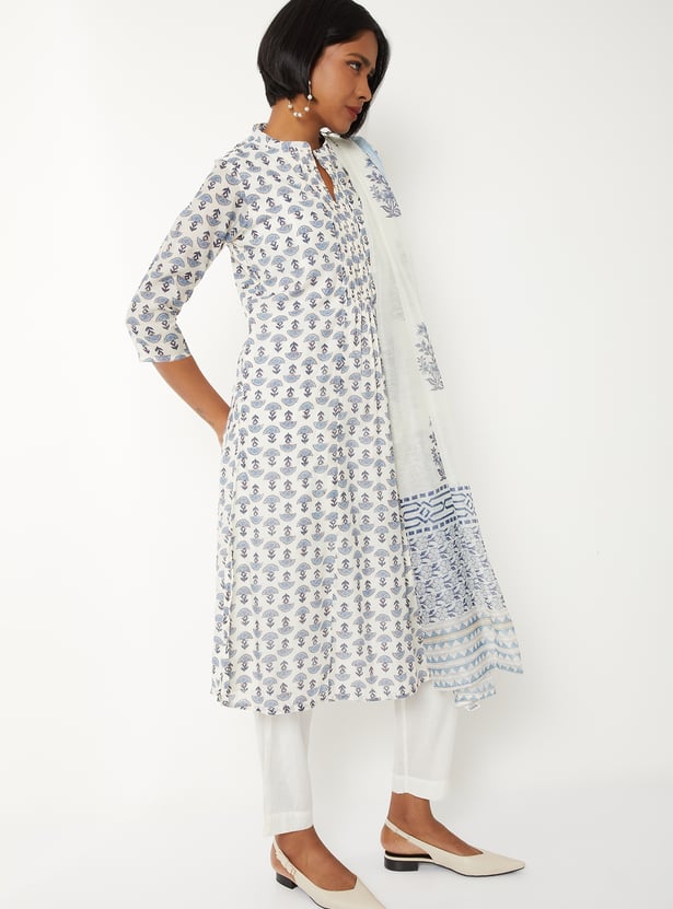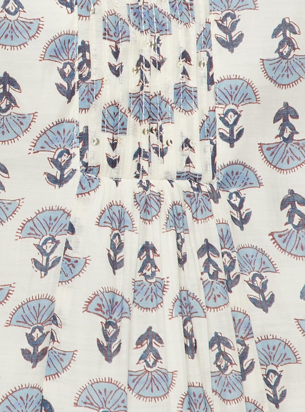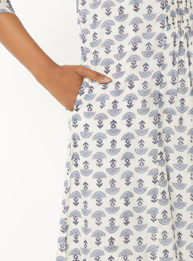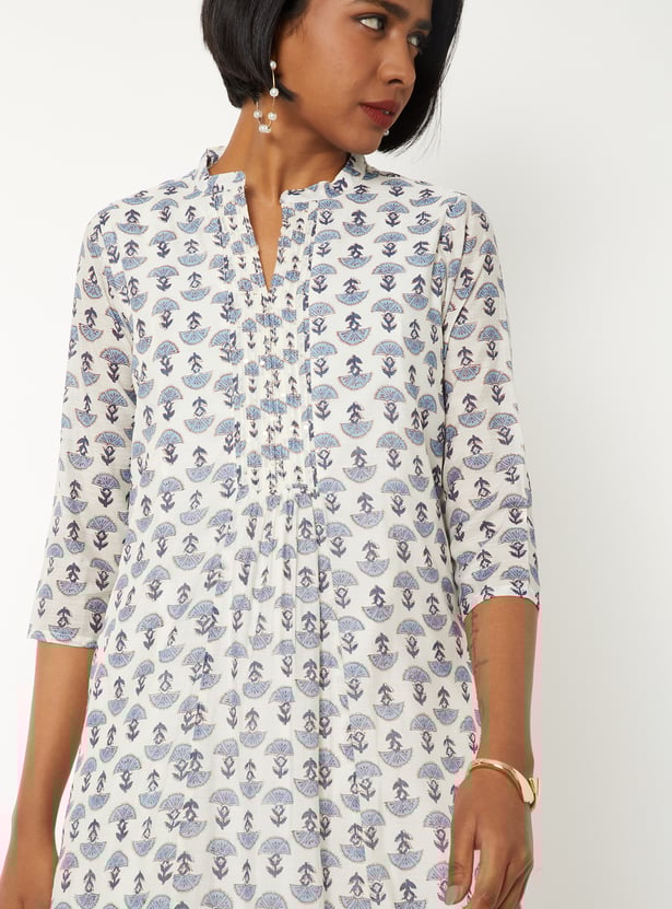 Effortlessly stylish, this printed A-line kurta is designed for comfort and elegance. Featuring a band collar, 3/4th sleeves, side slits, and a practical side pocket, it blends functionality with a graceful silhouette.