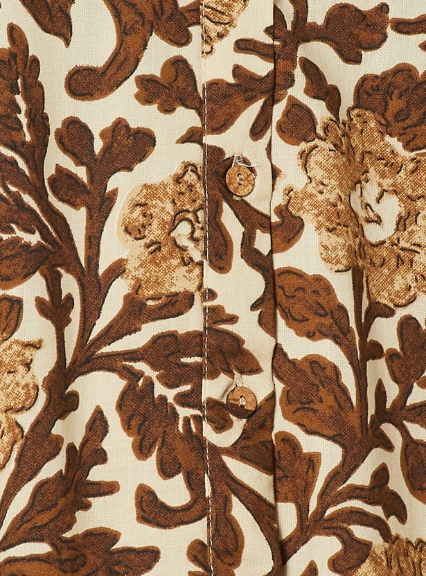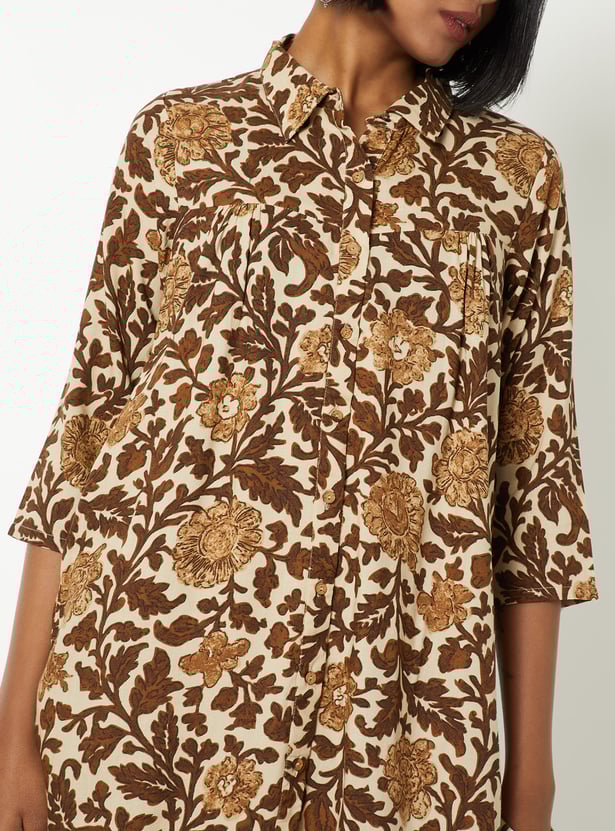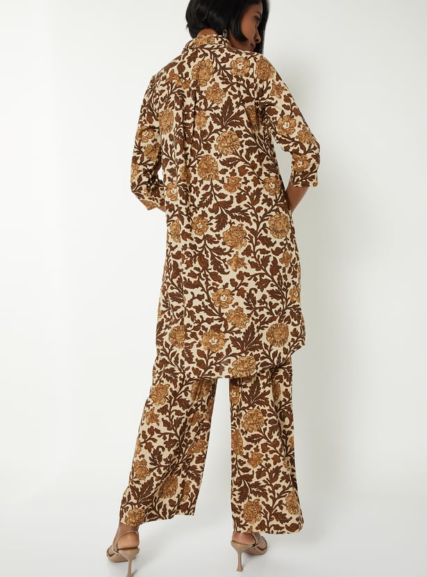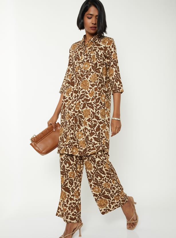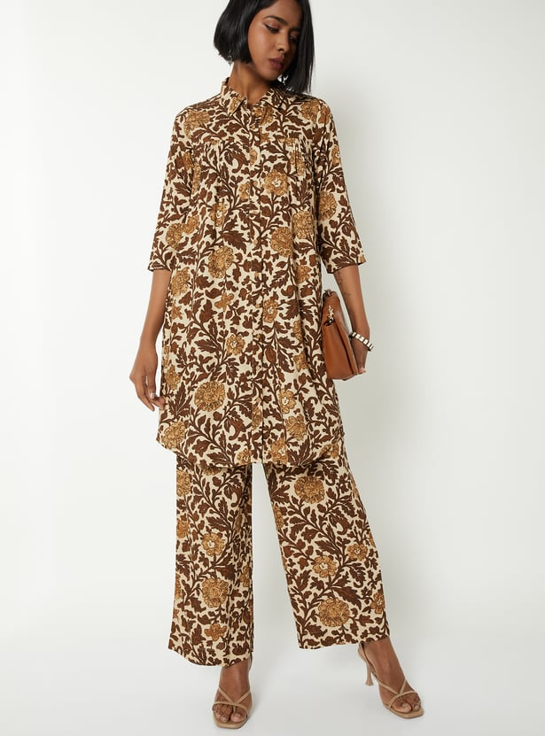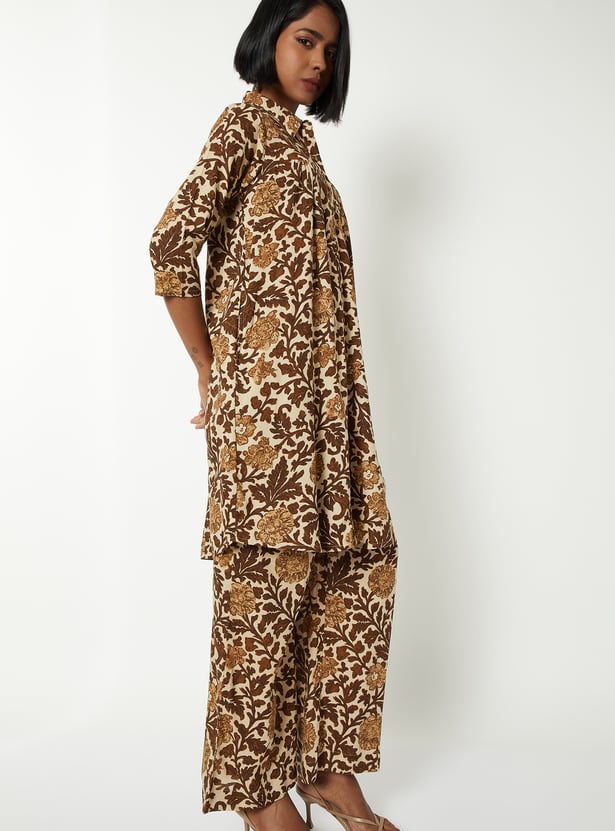 This printed short kurta set features a spread collar and 3/4th sleeves, paired with matching bottoms for a coordinated look. Designed in an A-line fit with one side pocket, it blends comfort with everyday elegance.