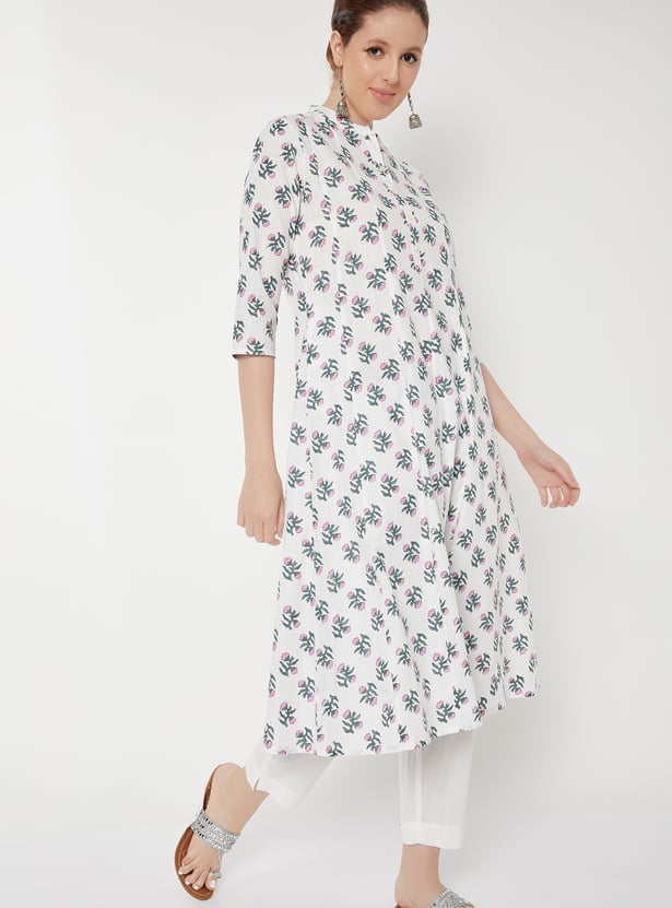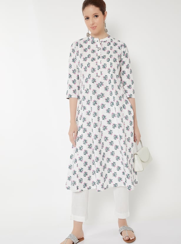 Elevate your ethnic wardrobe with this printed A-line kurta set, designed for comfort and elegance. The kurta features a band collar, button closure, side pocket, and 3/4th sleeves, offering a refined silhouette with practical detailing. It is paired with straight pants that have an elasticated waist, ensuring ease of movement and a relaxed fit.