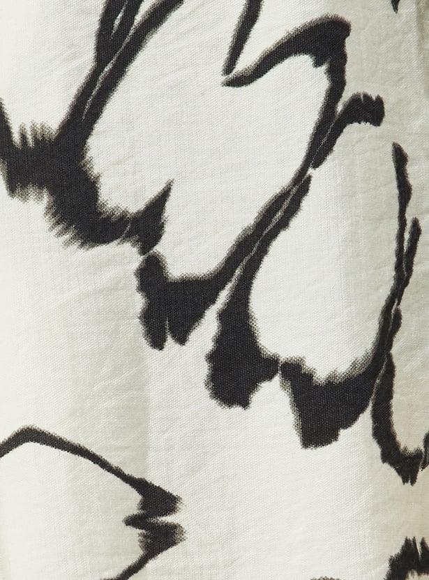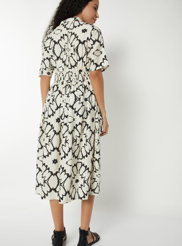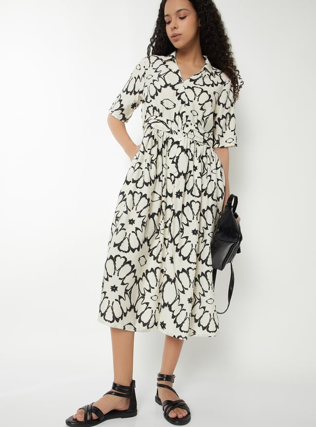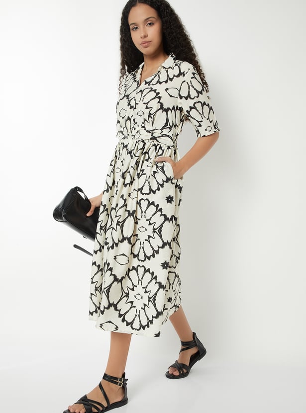 This printed midi dress features a spread collar design with a sharp shirt collar, a front-twisted detail that enhances the waist, and graceful half sleeves. The all-over print and fluid silhouette make it a perfect mix of poise and ease.
