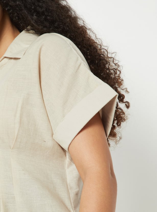 This printed A-line shirt dress features a spread collar, button-down front, and roll-up extended sleeves. Designed at calf length with a cinched waist detail, it flatters the silhouette while keeping the look effortlessly refined.