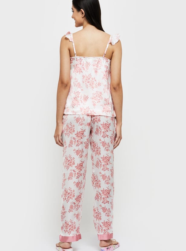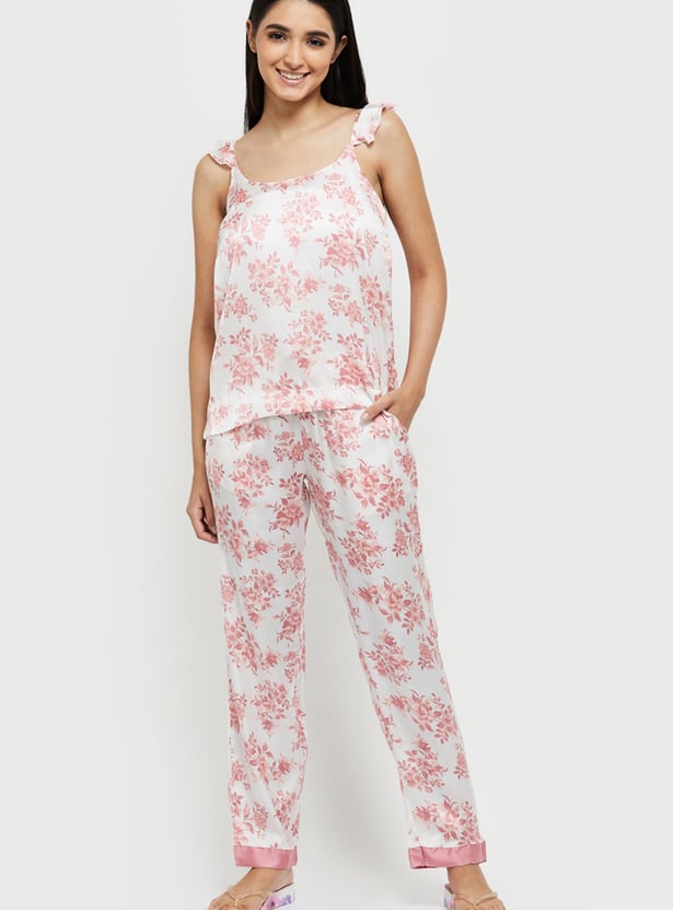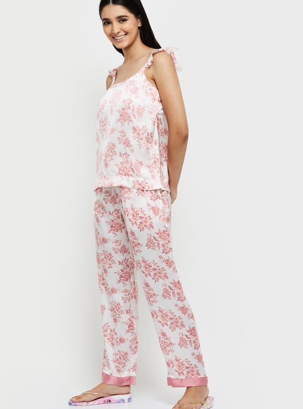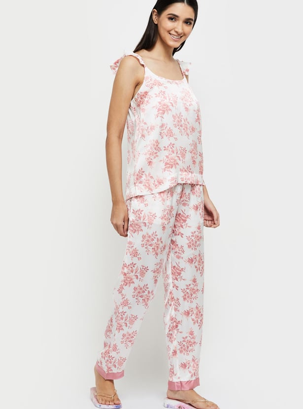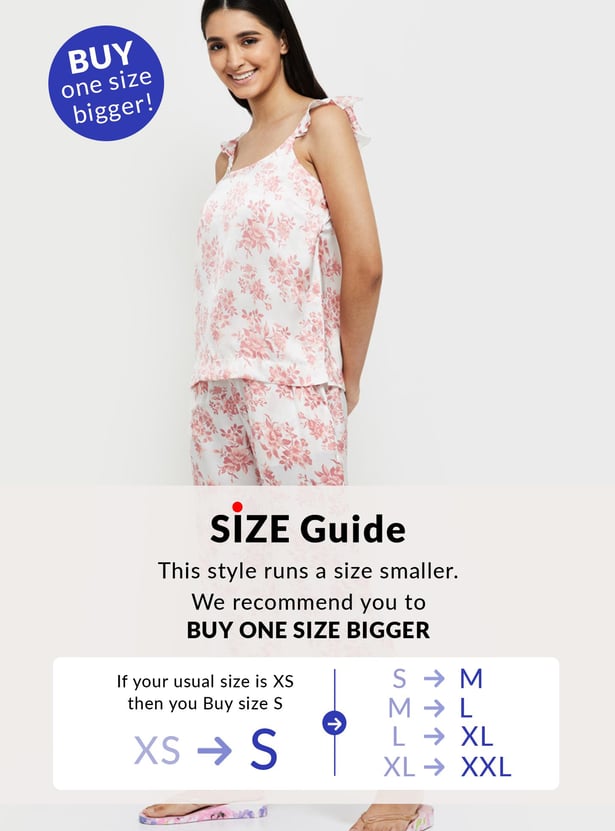 Style in comfort with this lounge set. This set comes with a printed top designed with a round neck and sleeveless silhouette along with a pair of elasticated pyjamas.