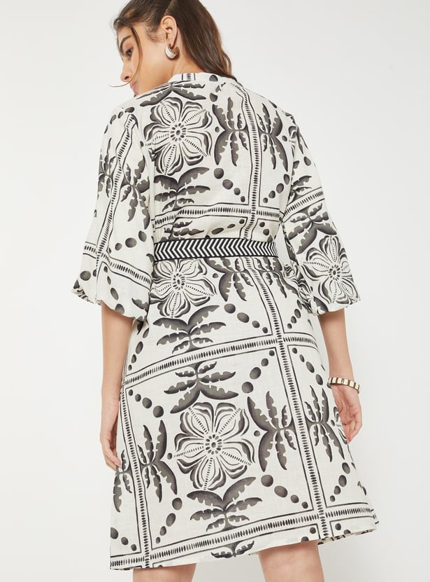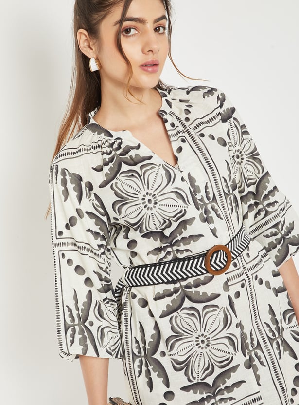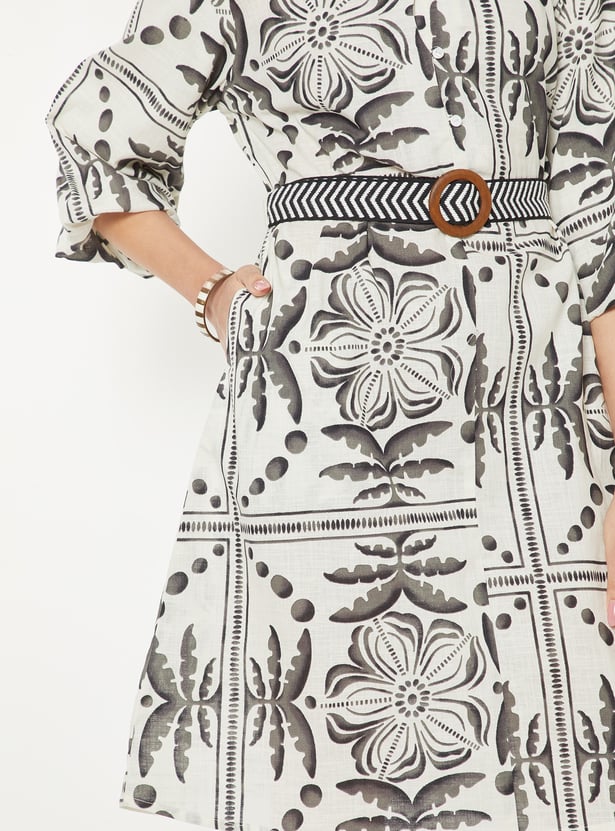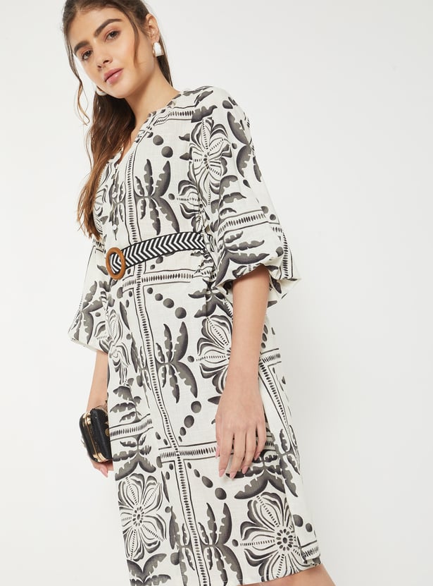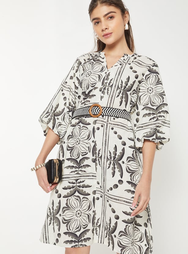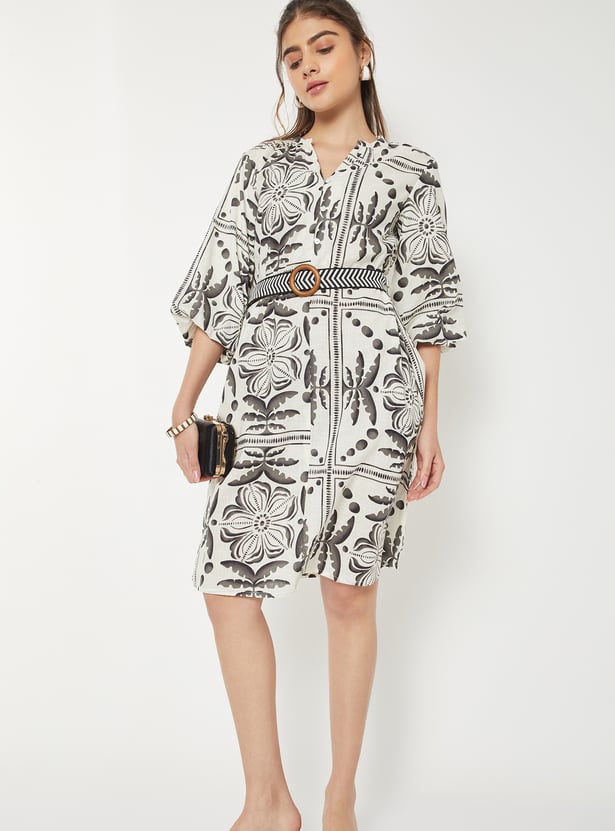 Refresh your wardrobe with this printed shirt dress with belt, designed with a refined band collar and a neat button closure. The 3/4th sleeves add a polished touch, while the matching belt cinches the waist for a flattering silhouette.