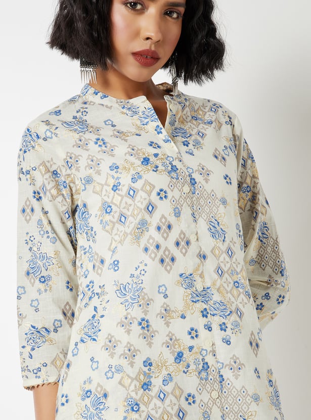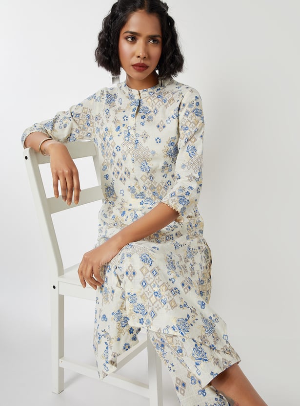Step out in effortless style with this printed straight kurta set. The kurta features a flattering band collar, 3/4th sleeves, side pockets, and side slits, paired with straight pants designed with an elasticated waist for easy comfort.