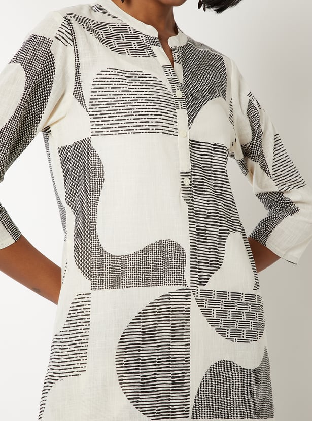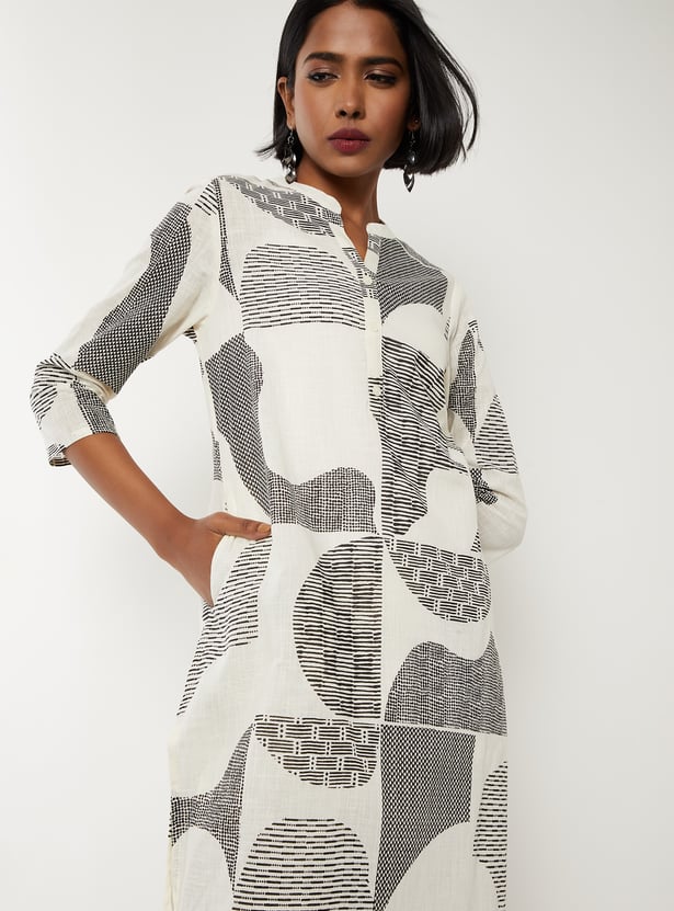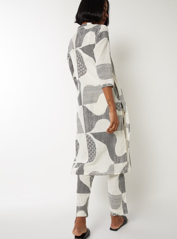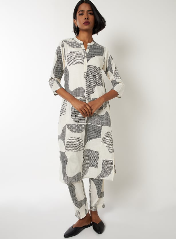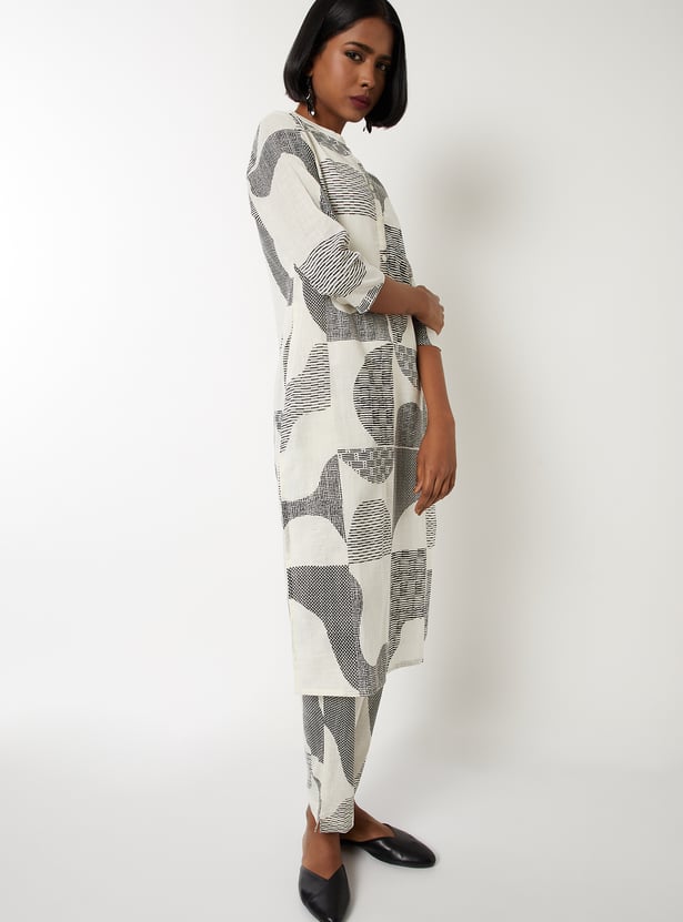 Add effortless elegance to your everyday wardrobe with this printed straight kurta set. The kurta features a band collar, 3/4th sleeves, side slits, and a practical side pocket. It's paired with straight pants featuring an elasticated waist for all-day comfort.