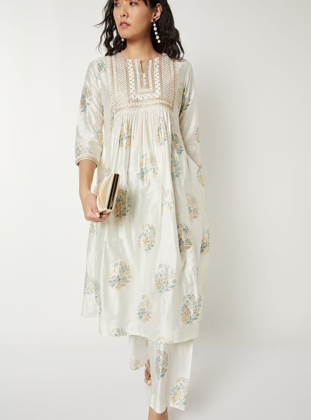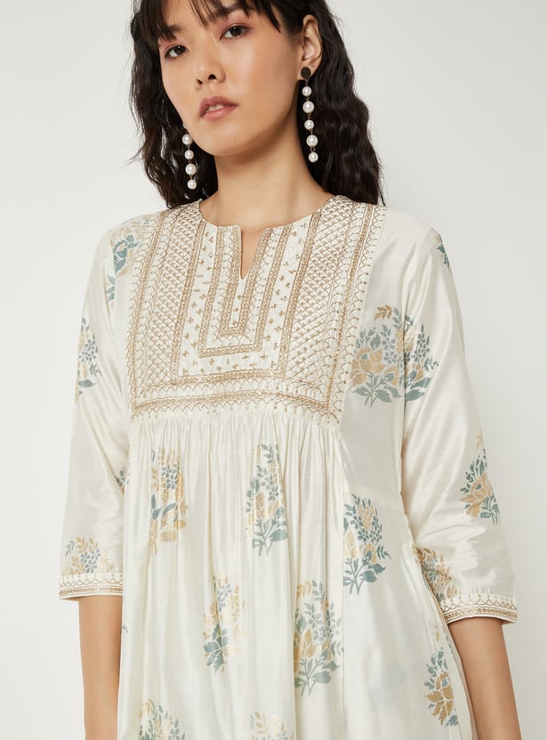 Step into effortless elegance with this printed straight kurta set. The kurta features a chic notch neck, an embroidered yoke, and 3/4th sleeves, paired with straight pants featuring an elasticated waist for comfort and style.