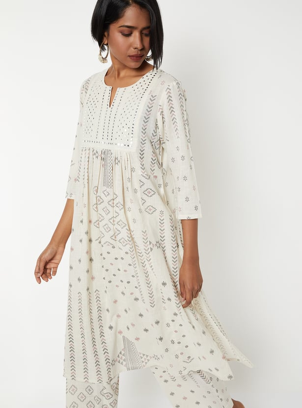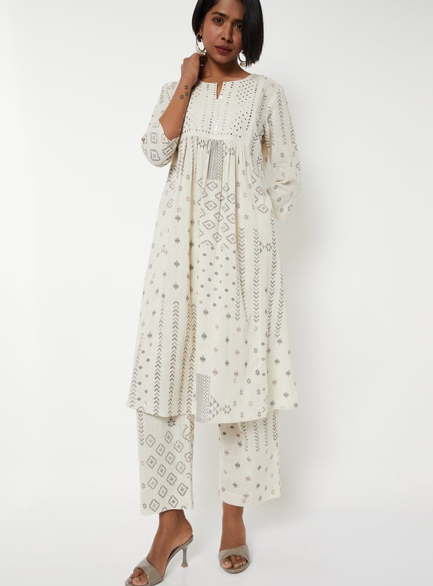 Bring effortless charm to your ethnic collection with this printed straight kurta set. The kurta is designed with a notched neckline, and 3/4th sleeves, offering a graceful silhouette. It’s paired with matching palazzos featuring an elasticated waist and pockets.