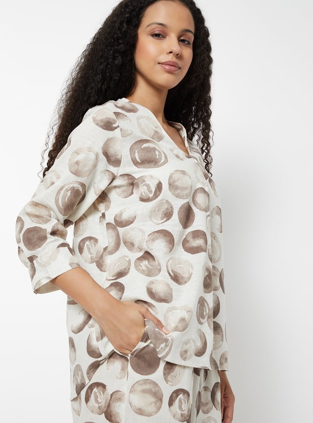 This printed tunic features a flattering V-neckline with delicate pleat detailing that adds a soft, feminine touch. Designed in a regular fit with 3/4th sleeves and buttoned cuffs, the short top is perfect for everyday wear.