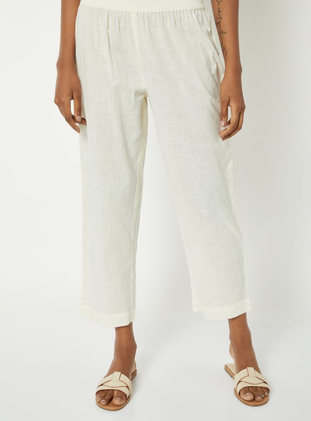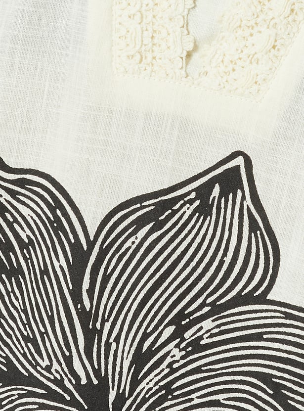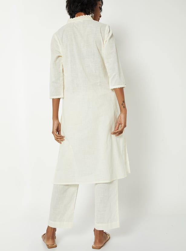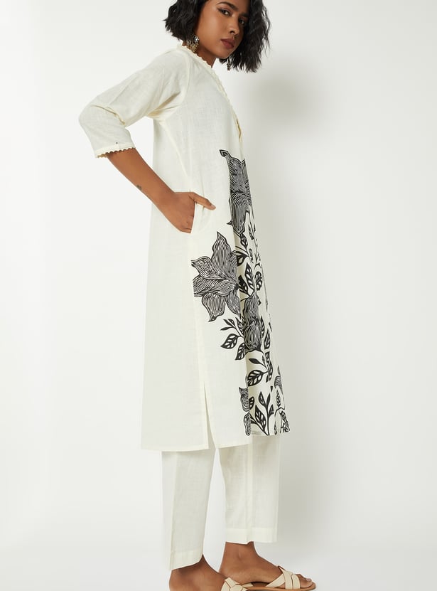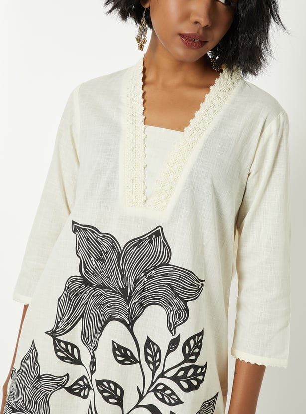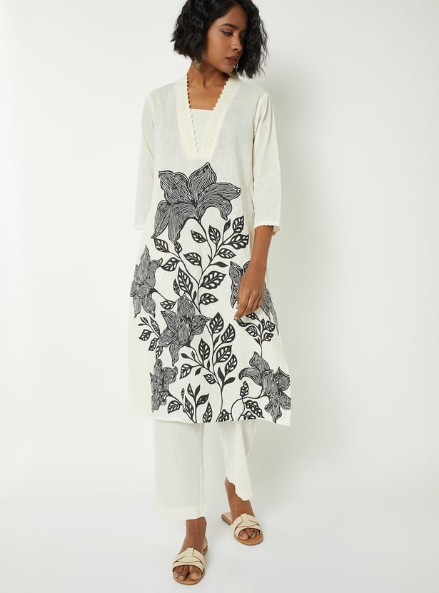 This printed kurta set features a V-neckline with delicate embroidery, 3/4th sleeves, and a convenient side pocket. Paired with a solid bottom featuring an elasticated waist, it offers a regular fit that blends comfort with refined style.