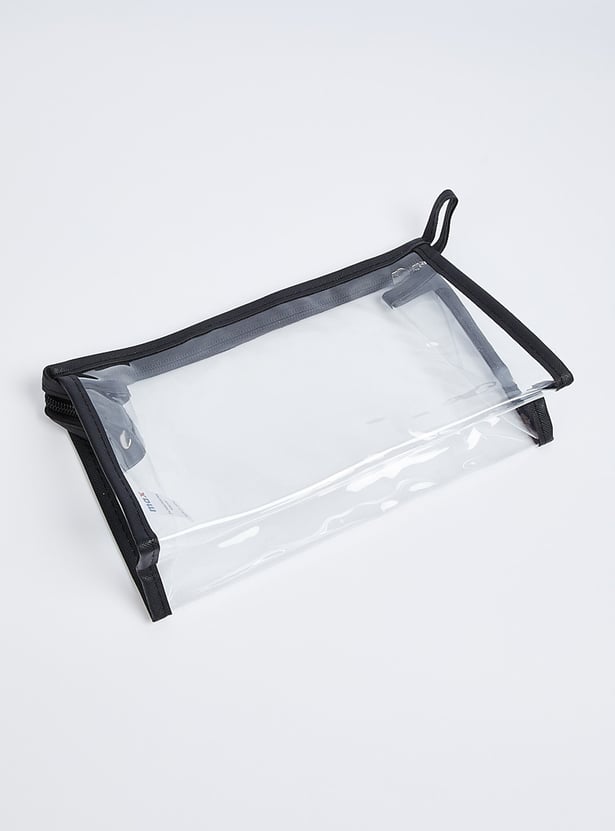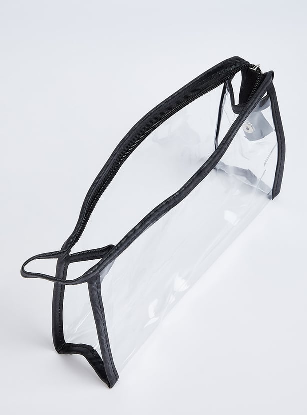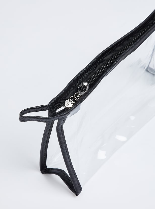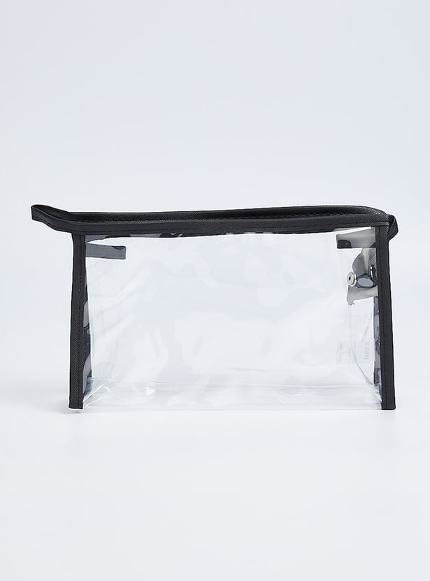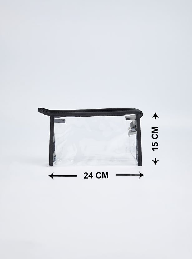 Keep all your essentials organized with these elegant pouches, each featuring an assortment of patterns. One pouch features a transparent exterior, while the other two showcase stylish printed designs with zip closures. They are perfect for storing your makeup essentials in style.