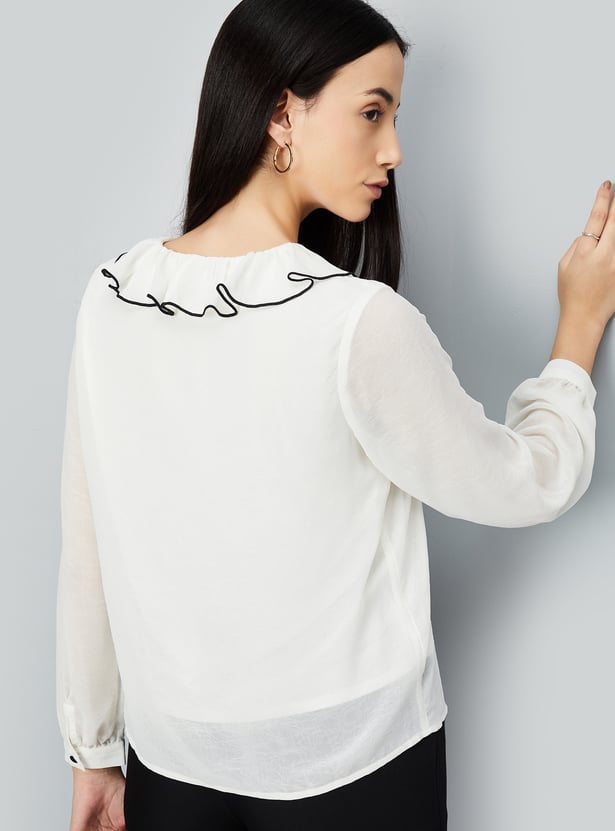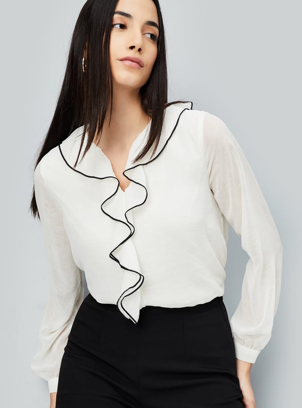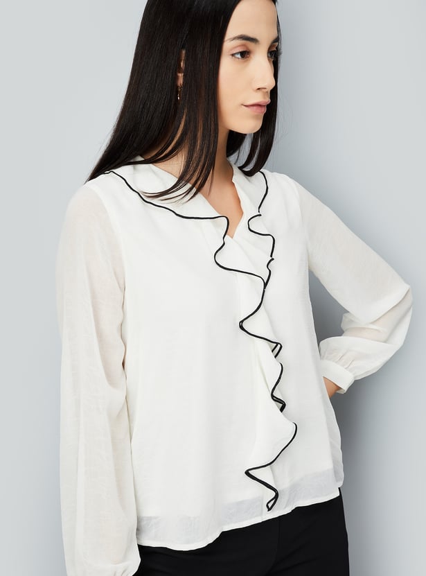 Look effortlessly chic in this casual top, designed to elevate your everyday style. It features charming ruffled details at the neck, full sleeves for added comfort, and a flattering curved hem that adds a touch of elegance.