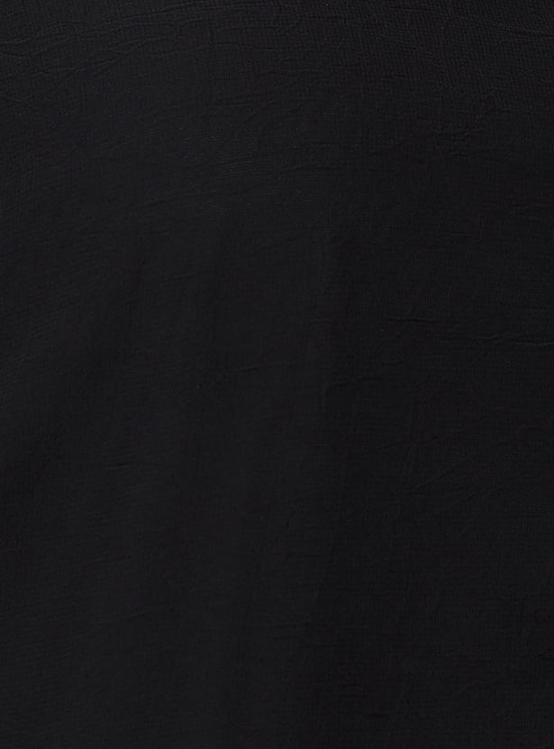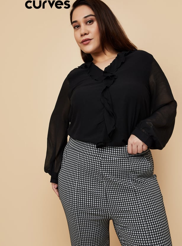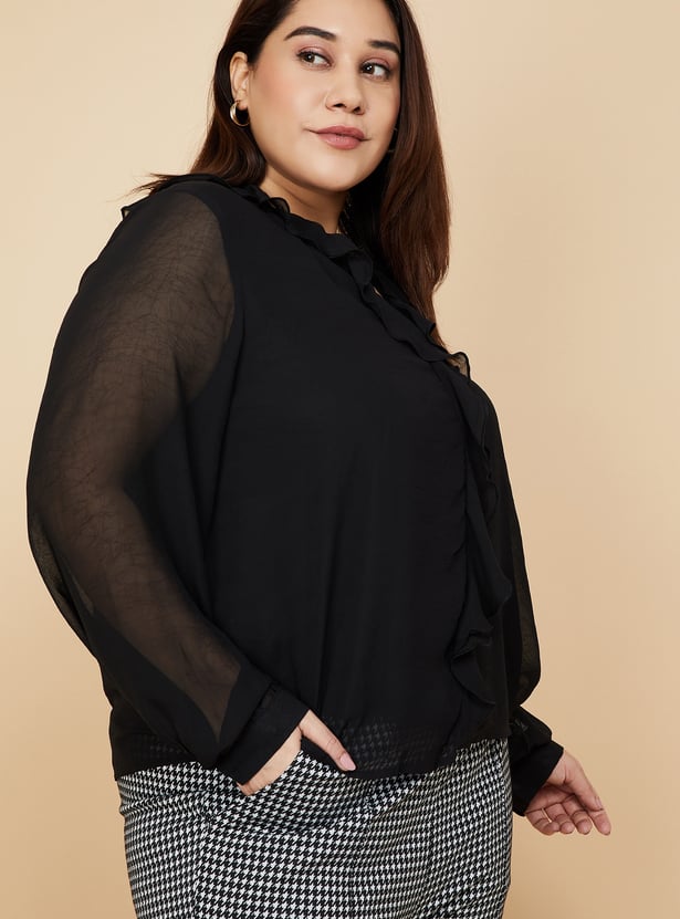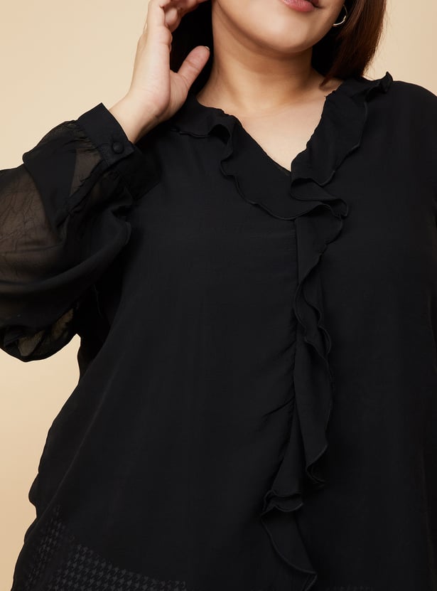 Look effortlessly chic in this casual top, designed to elevate your everyday style. It features charming ruffled details at the neck, full sleeves for added comfort, and a flattering curved hem that adds a touch of elegance.