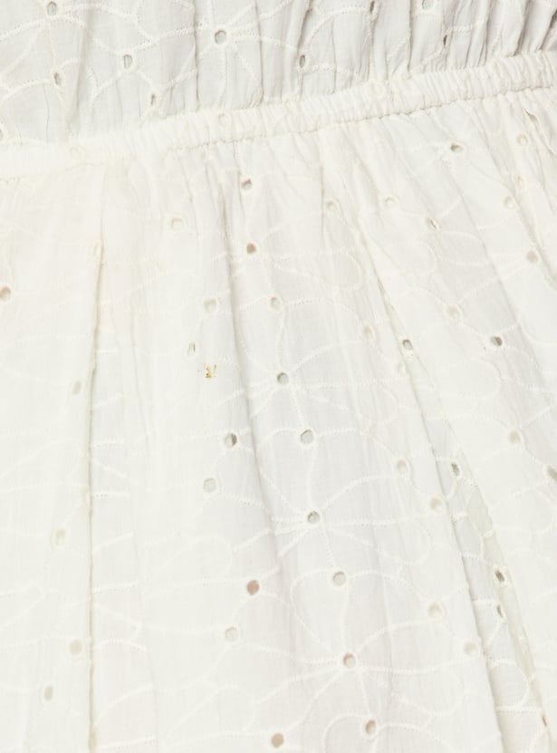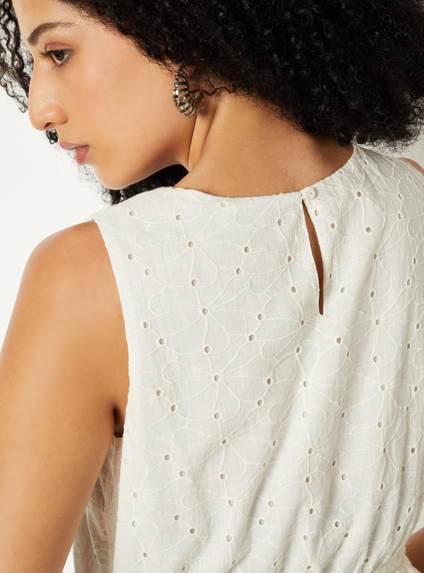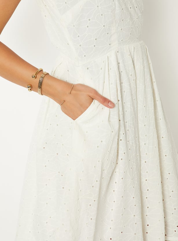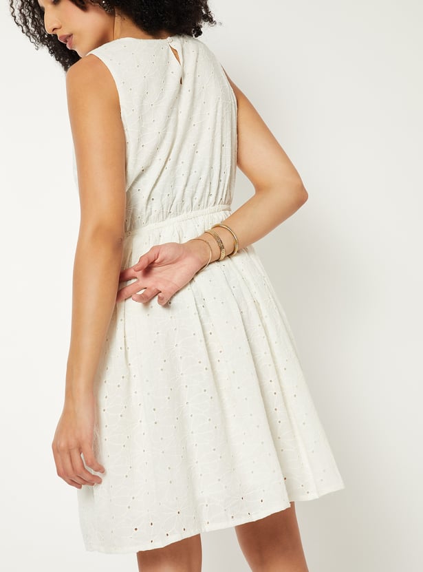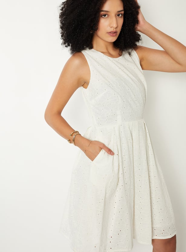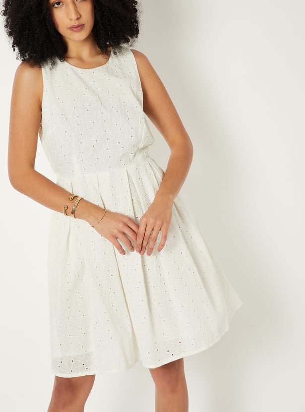 Bring feminine charm to your wardrobe with this schiffli A-line dress. Designed with a classic round neck and no sleeves, it features a knee-length pleated skirt and a back button closure for a refined finish.