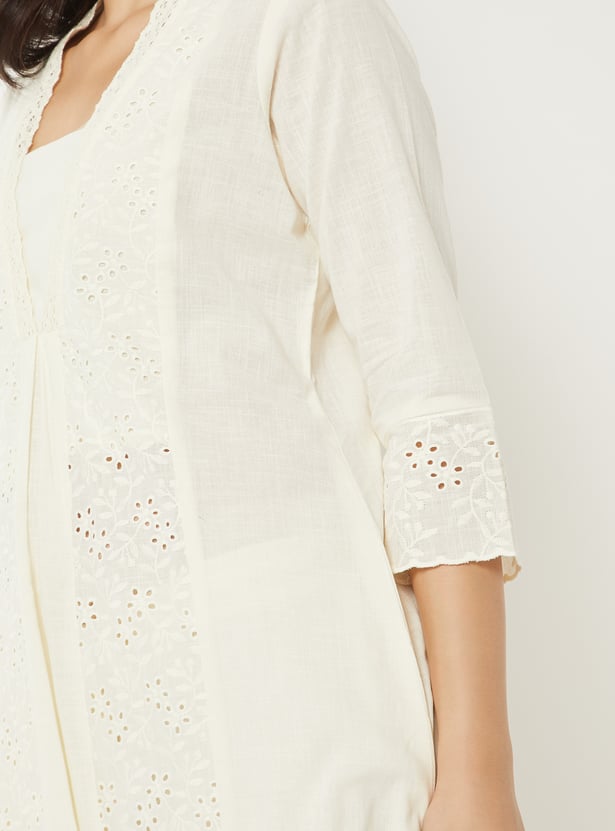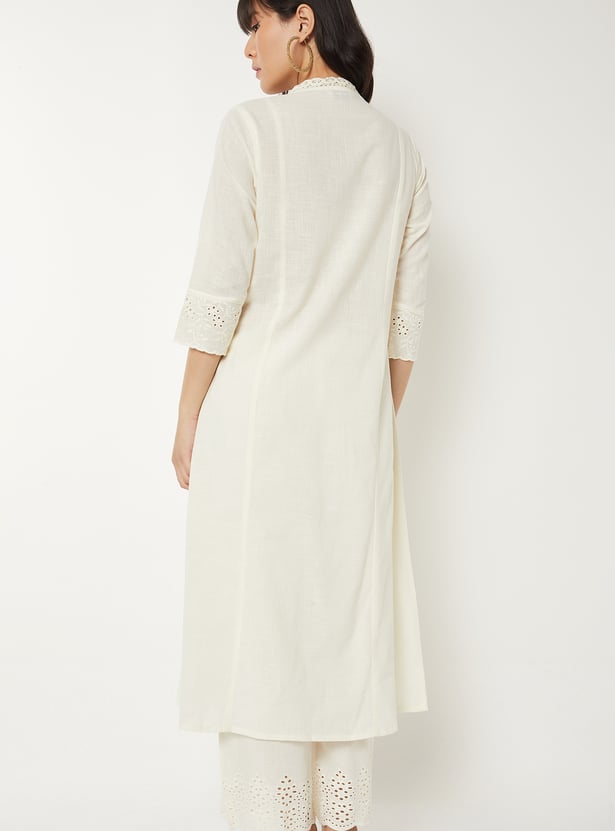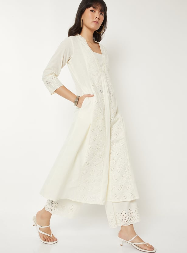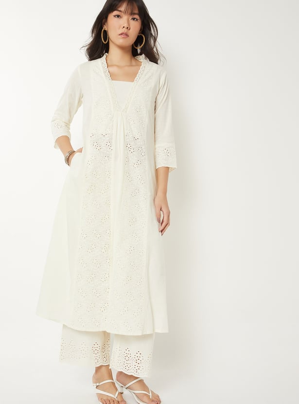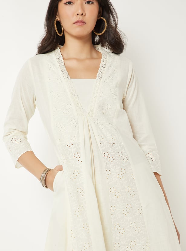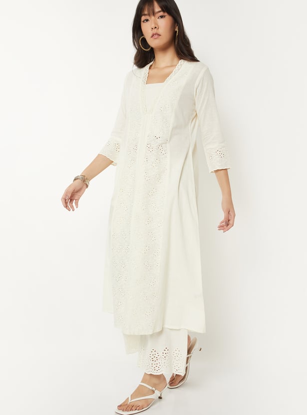 Bring effortless elegance to your wardrobe with this Schiffli A-line kurta. Designed with a flattering V-neck, calf-length silhouette, and 3/4th sleeves, it combines timeless style with everyday comfort. A practical side pocket adds functionality to its chic design